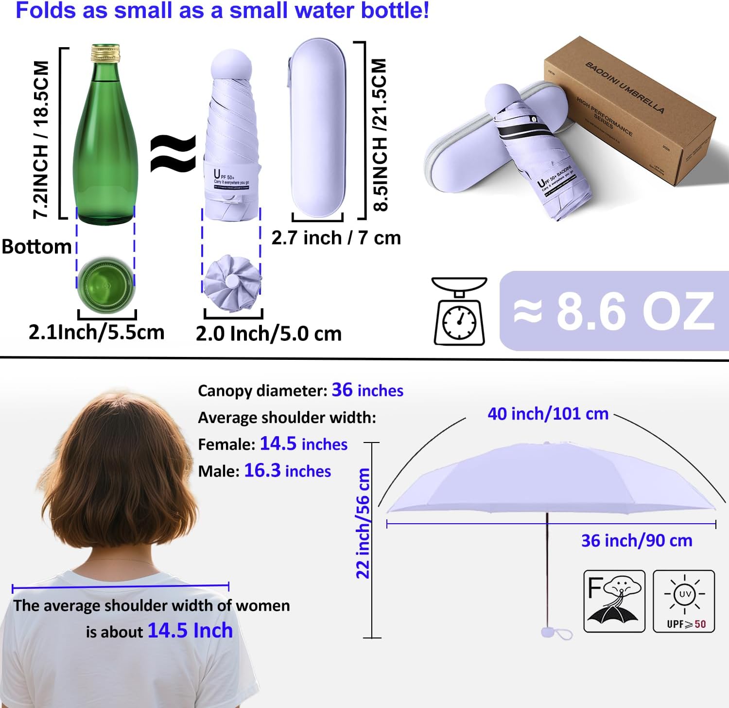 BAODINI Travel Essentials Mini Umbrella for Purse With Case Small Compact UV Sun Protection Lightweight Tiny Pocket Manual Open Close Umbrella for Women Kids and Men Fit Purse Backpack