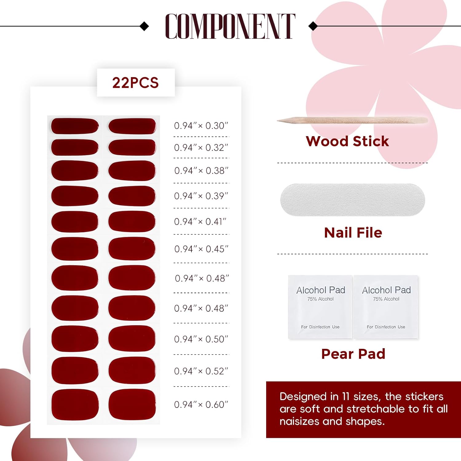 Gloss Nail Strips|Uv Free|22 Pcs,Gel Nail Stickers|Long Lasting Two Weeks and Easy to Apply&Remove|Burgundy