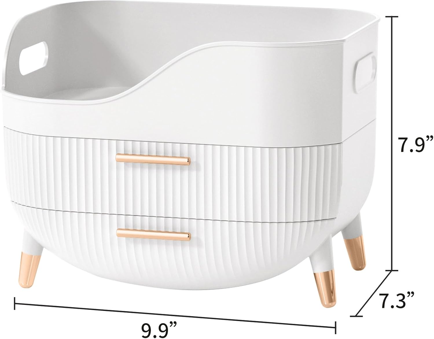 - Appearance and size:9.9”L×7.3”W×7.9”H,Large capacity cosmetic organizer with 2 drawers and top compartment,can organize tall bottles of skincare and cosmetics,Household containers for storing and organizing makeup