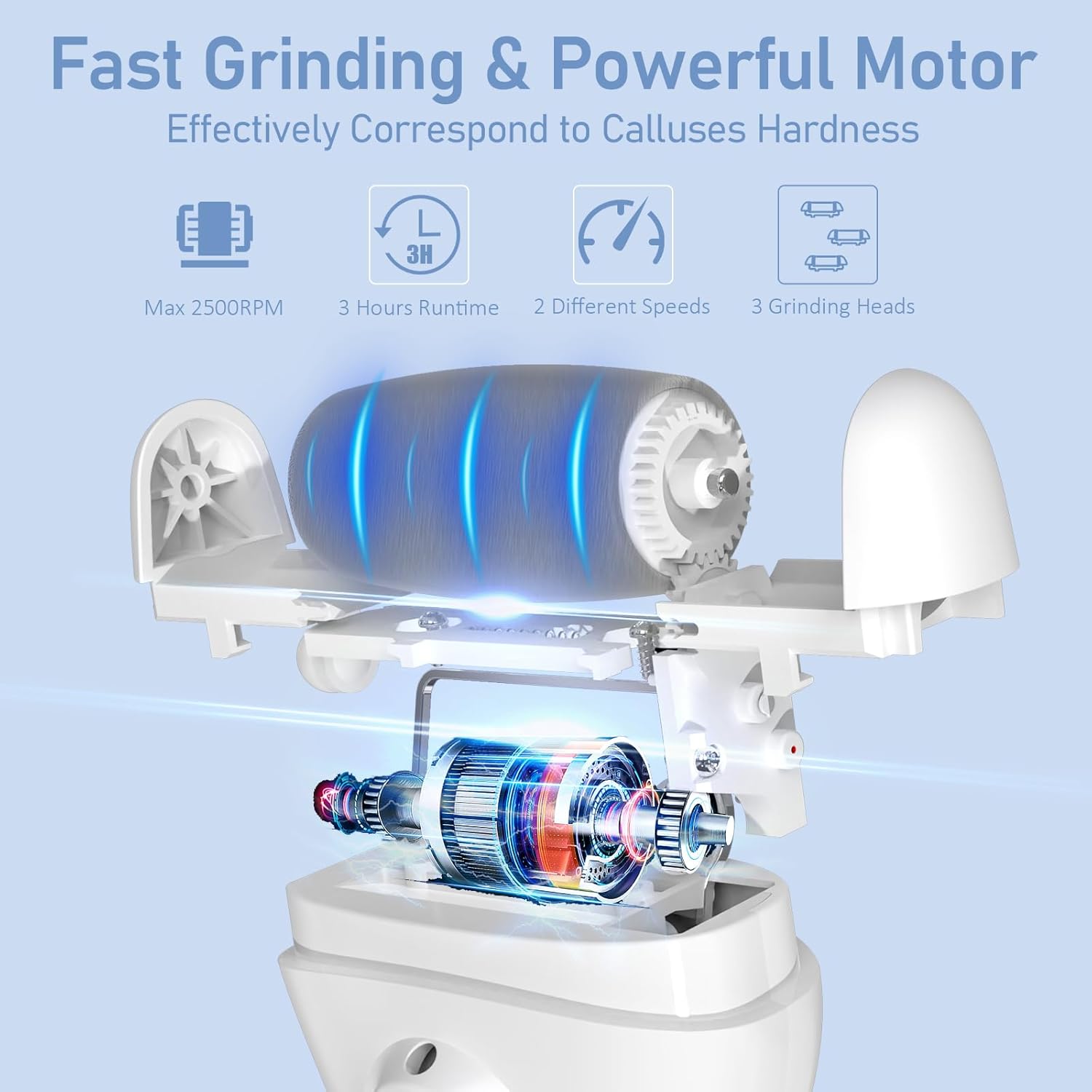 - Pedicure kit with 3 Larger Grinding Head, 2 Speed, with LED lights - With more Bigger , more Larger Quartz Crystals Roller Heads, you could enjoy a more Faster,Finer, Effective, Stable Grinding callus remove foot care at home , 2 Speed (upgrade 2500RPM) Correspond to the roughness required to remove the calluses on the feet; with LED lights, automatically turn on while the foot grinder began working, help you see more clear and remove the deadskin around all angles .