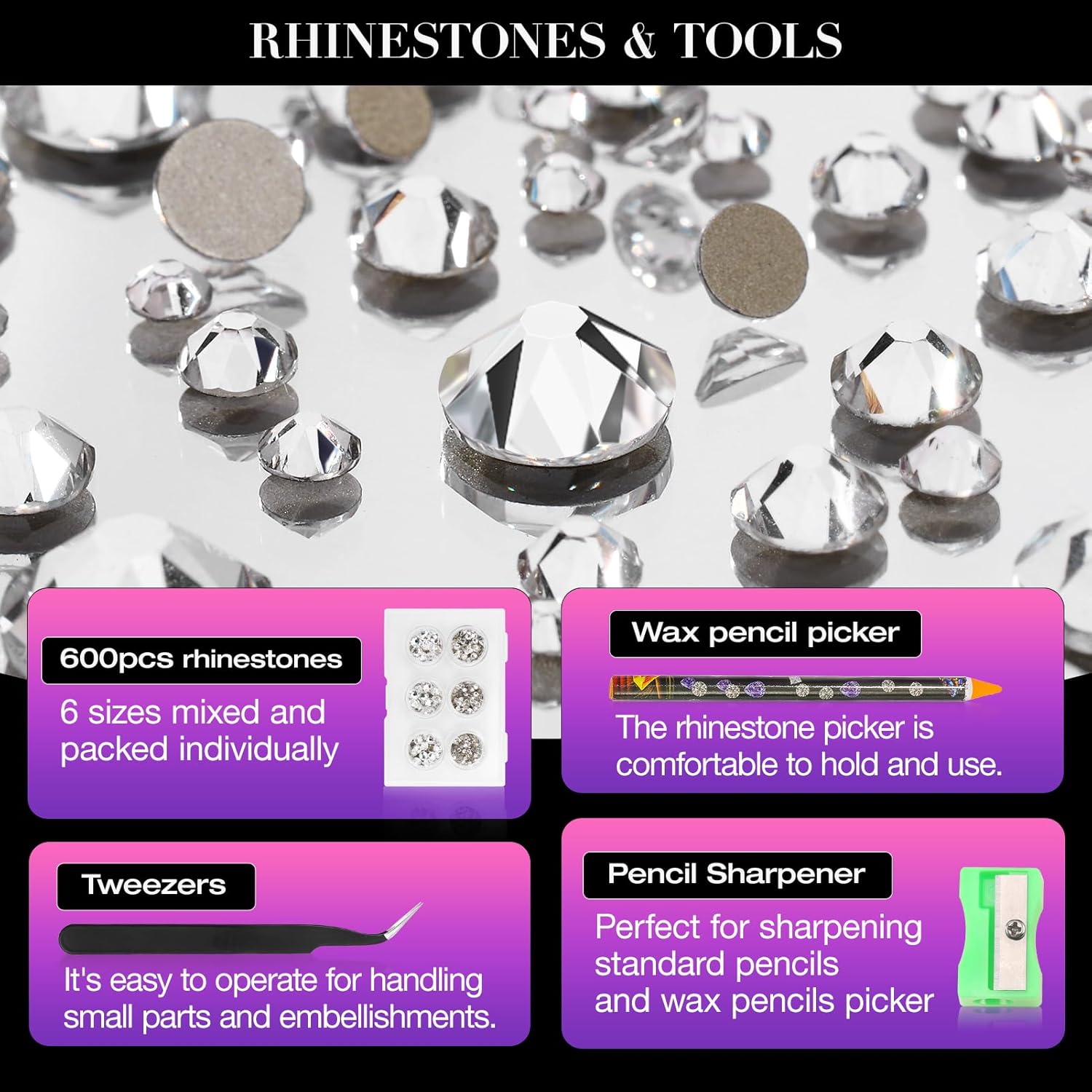 - Rhinestones: Pack of 600 Pieces Crystal Clear Rhinestones, mixed 6 sizes, SS12 (3.0-3.2mm), SS16 (3.8-4.0mm), SS20 (4.6-4.8mm), SS30 (6.4-6.6mm), SS34 (7.1-7.3mm), SS40 (8.3-8.6mm).