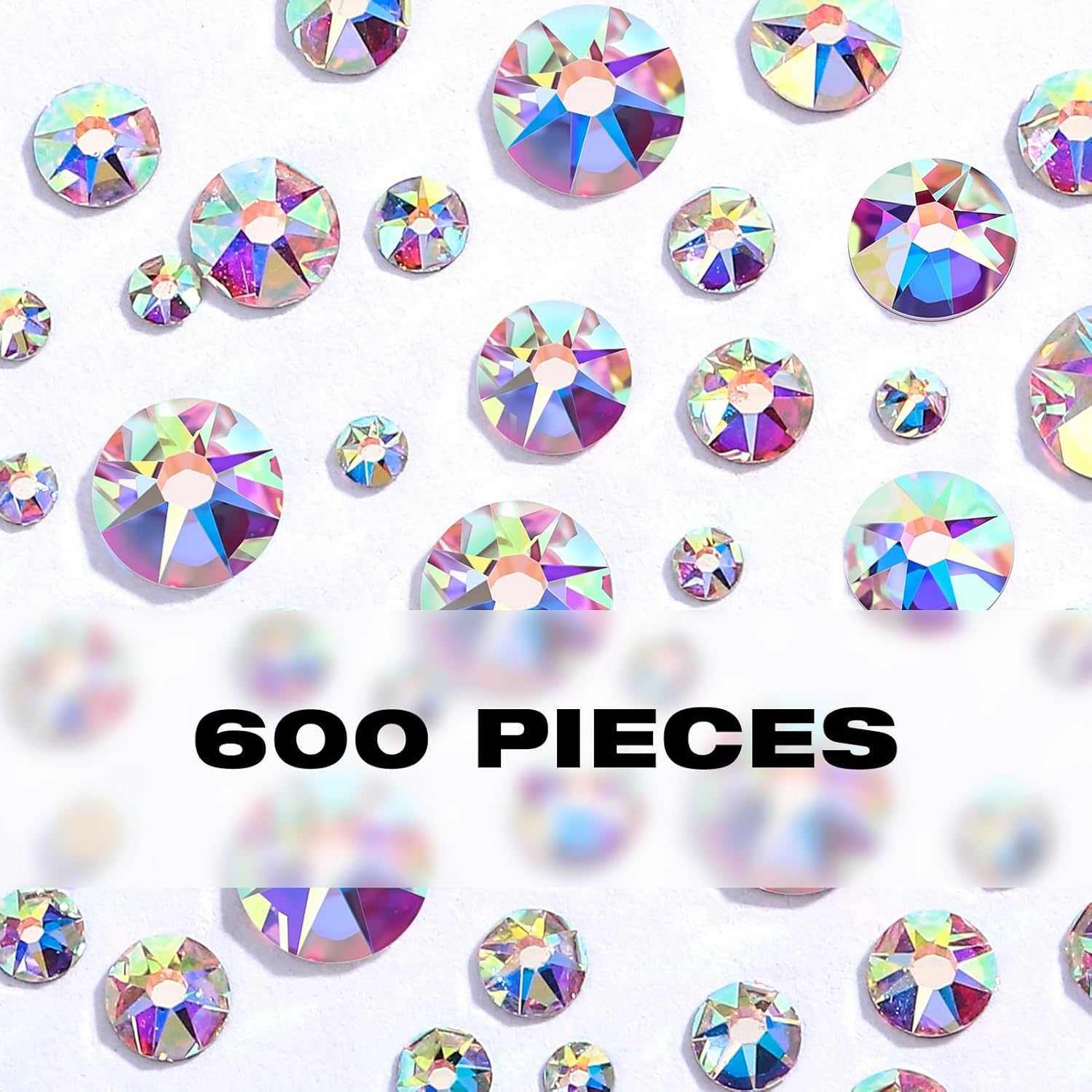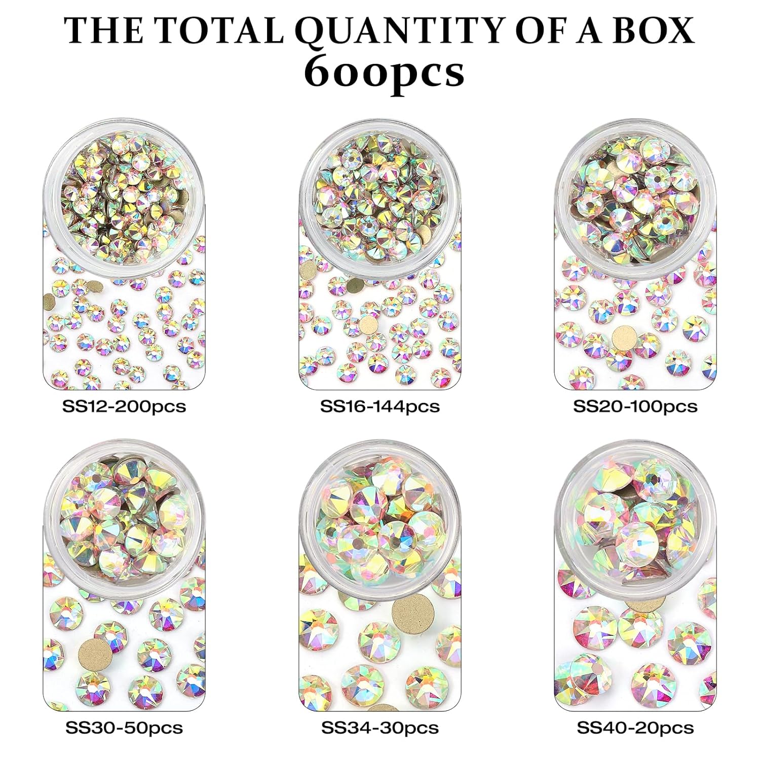 - Rhinestones: Pack of 600 Pieces Crystal AB Rhinestones, mixed 6 sizes, SS12 (3.0-3.2mm), SS16 (3.8-4.0mm), SS20 (4.6-4.8mm), SS30 (6.4-6.6mm), SS34 (7.1-7.3mm), SS40 (8.3-8.6mm).