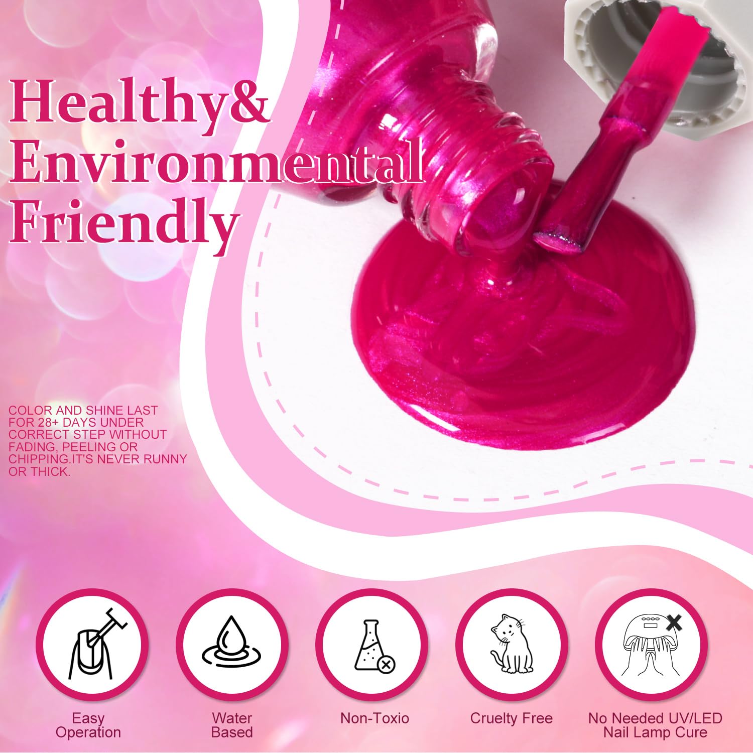 - NOTE: This nail polish is resistant to chipping and peeling, but for a longer-lasting shine, we recommend applying a top coat to keep the gloss for over 15 days!