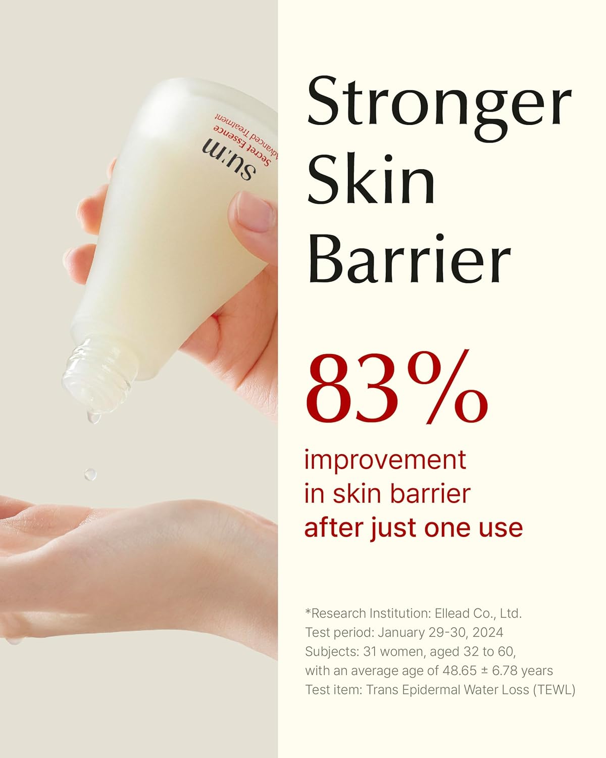 - SU:M SECRET ESSENCE (30ml/1.01fl oz) - This essence deeply hydrates and strengthens the skin's barrier, helping to enhance elasticity, smoothness, and natural vitality for a refreshed and youthful appearance.