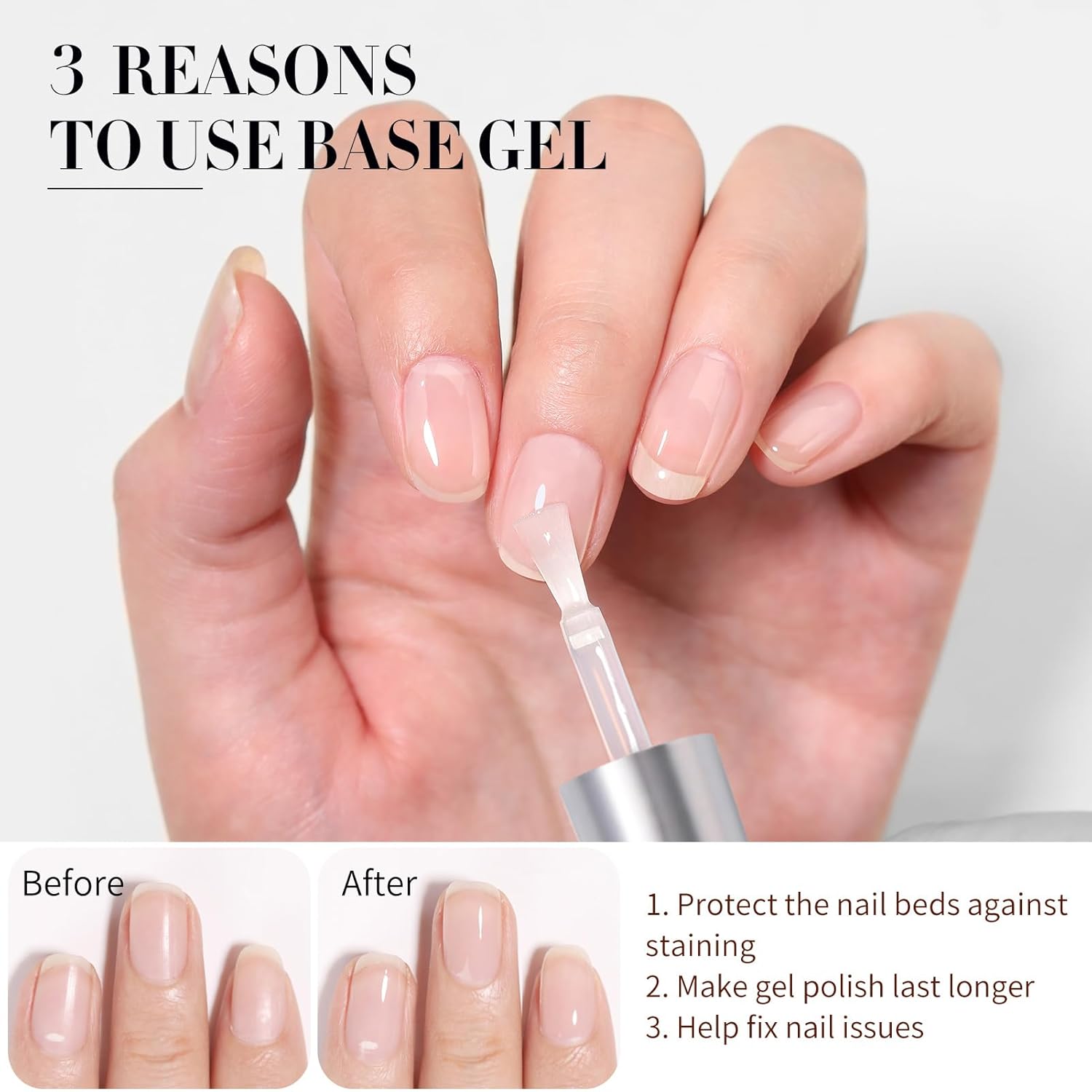 - EFFECTIVE FUNCTIONS OF BASE GEL: Increases the adhesion of nail and color gel. Apply a thin and average base gel and make your nail art stay longer.Help fix minor nail issues,easy to remove.