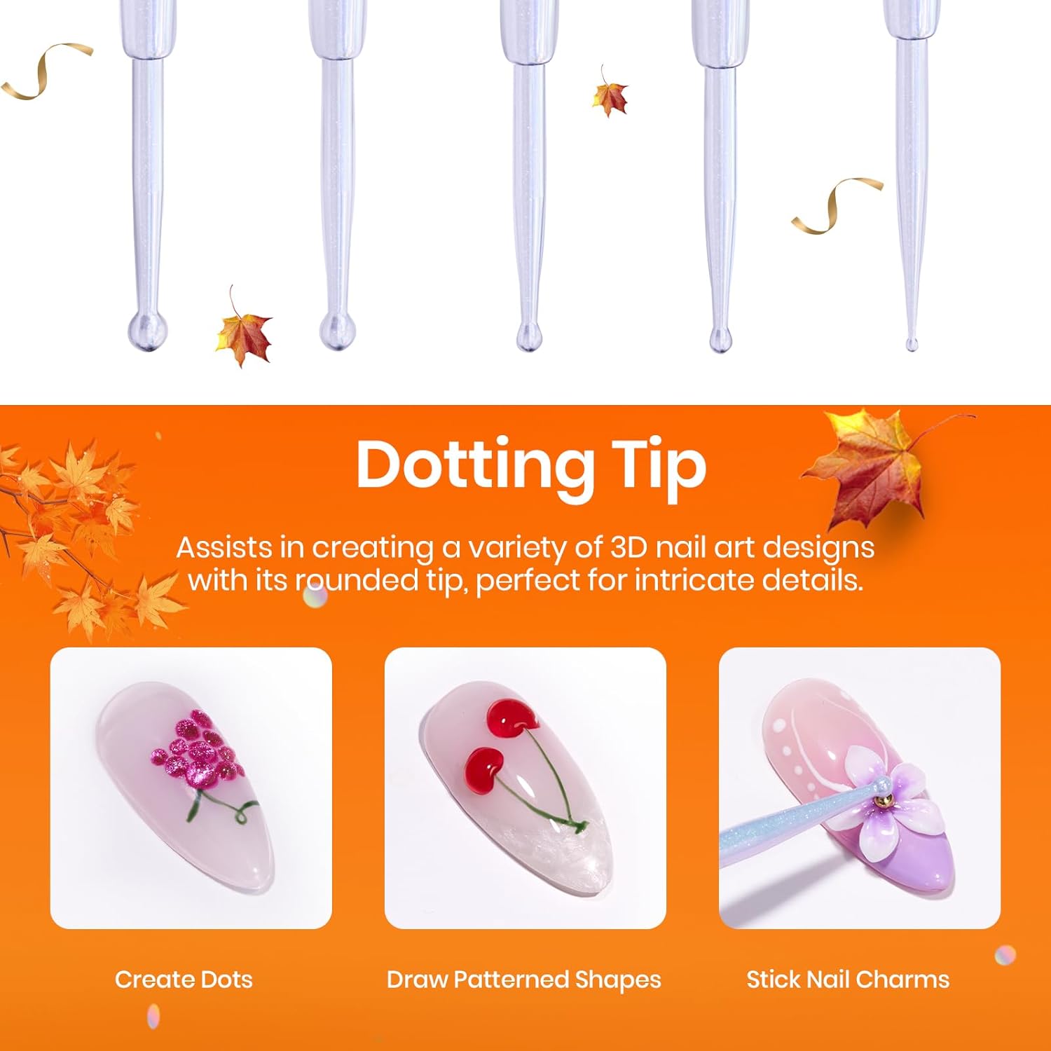 - 5Pcs Dotting tools: The other end features five dootting tips of varying sizes, specifically designed for adhering diamonds and assisting in drawing 3D nail art patterns. From tiny rhinestones to complex pattern, precise dot application ensures your nail art shines brightly.