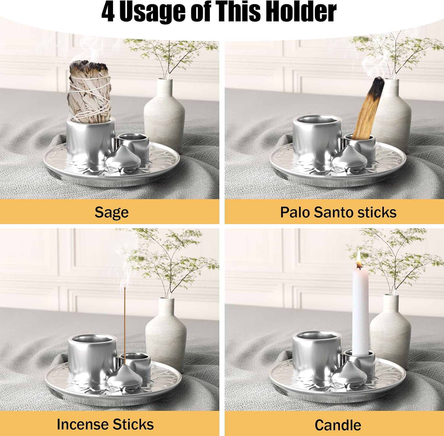 Palo Santo Holder - 4 in 1 Incense & Candle Holder - Ceramic Incense Holder Ash Catcher Tray for Meditation Room - Easy to Clean (Silver)