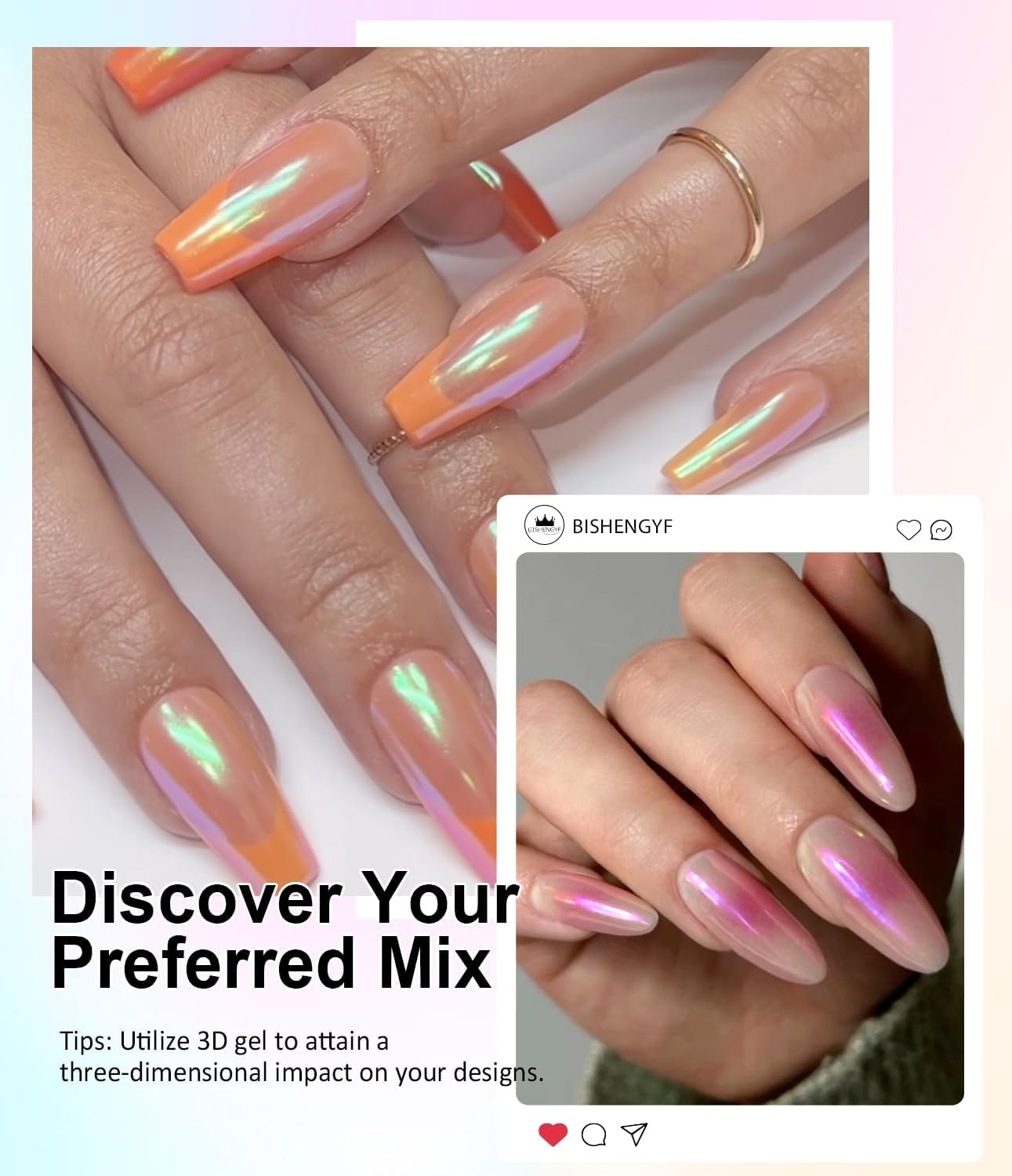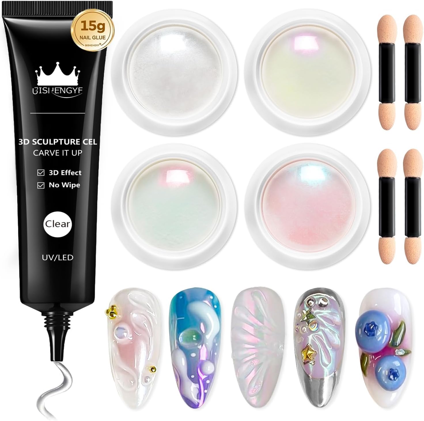 - 3D Nail Gel & Chrome Powder Kit: BISHENGYF upgraded 3D nail art sculpting gel kit include 15g clear nail sculpting gel, mermaid white green purple and pink chrome powders, and sponge sticks. Friendly for nail beginners and nail lovers, allows nail art beginners to create stunning nails at home and DIY enthusiasts for 3D gel nail art sculpture.