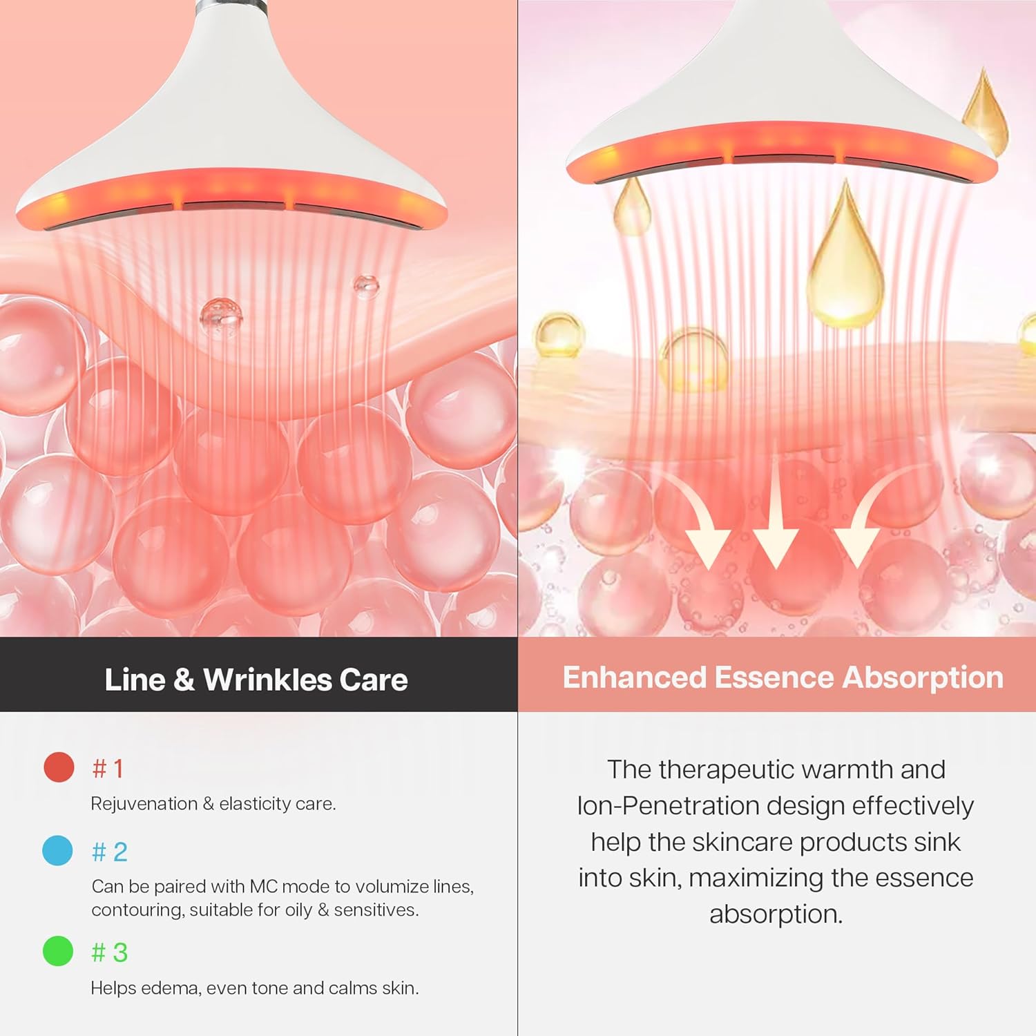 - 【Overall Care Device】 This all-in-one device combines MC mode, Triple-Action Care and Thermal to enhance absorption, radiance, and for different skincare concerns. For a personalized session, the MC mode (the waveform symbol indicator) can be switched off/on by double-clicking the universal button, and mircro-vibration activates only when the massage head touches the skin.