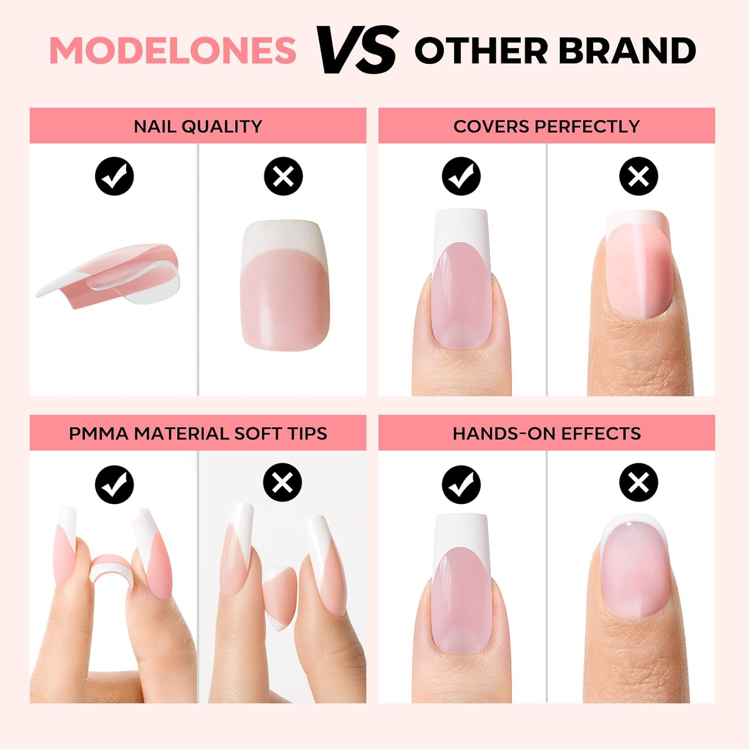 - PMMA Soft Material: These premium French nails tip feature flexible yet durable PMMA soft gel material with a pre-designed curvature that seamlessly blends with your natural nail shape for a flawless, salon-quality finish.