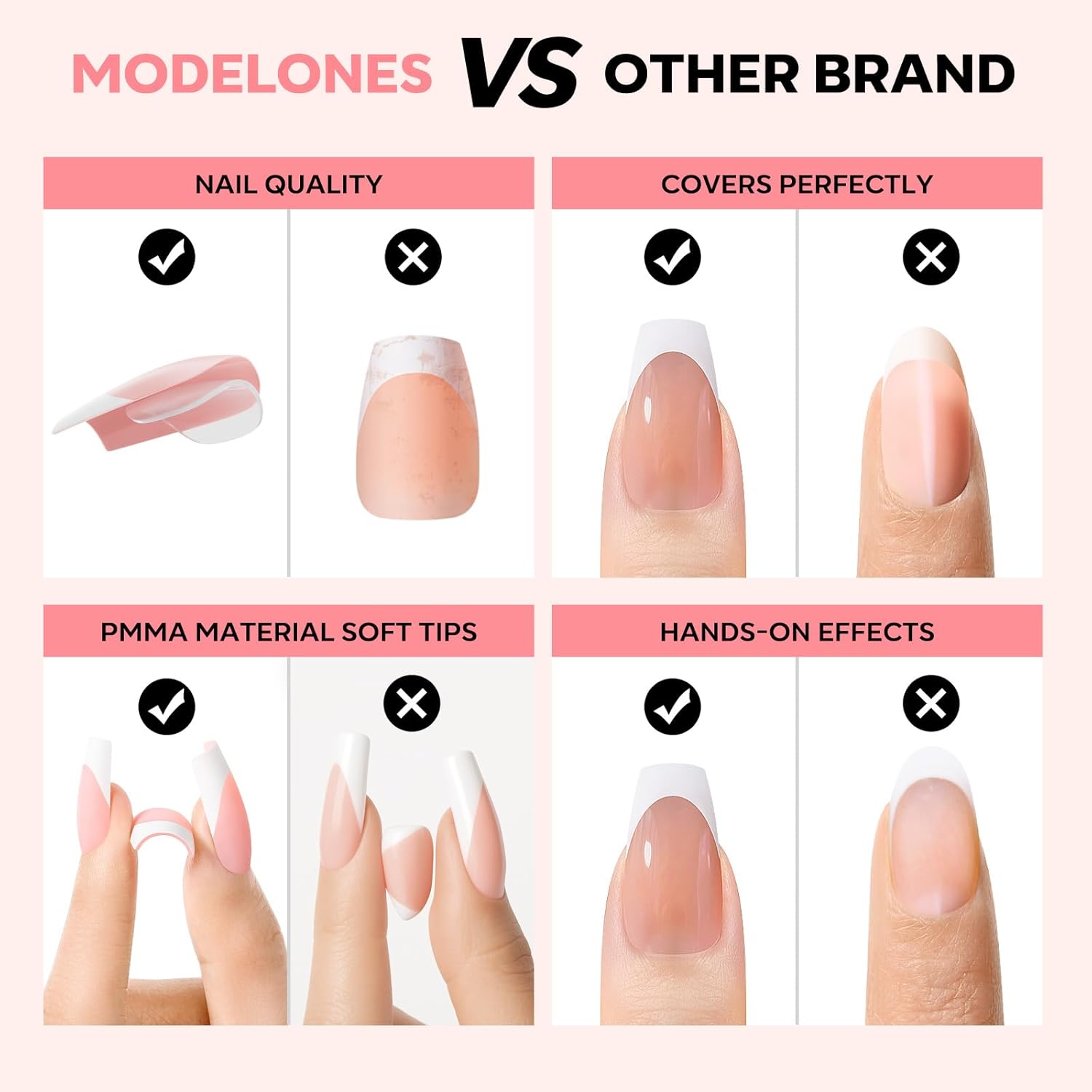 - PMMA Soft Material: These premium French nails tip feature flexible yet durable PMMA soft gel material with a pre-designed curvature that seamlessly blends with your natural nail shape for a flawless, salon-quality finish.