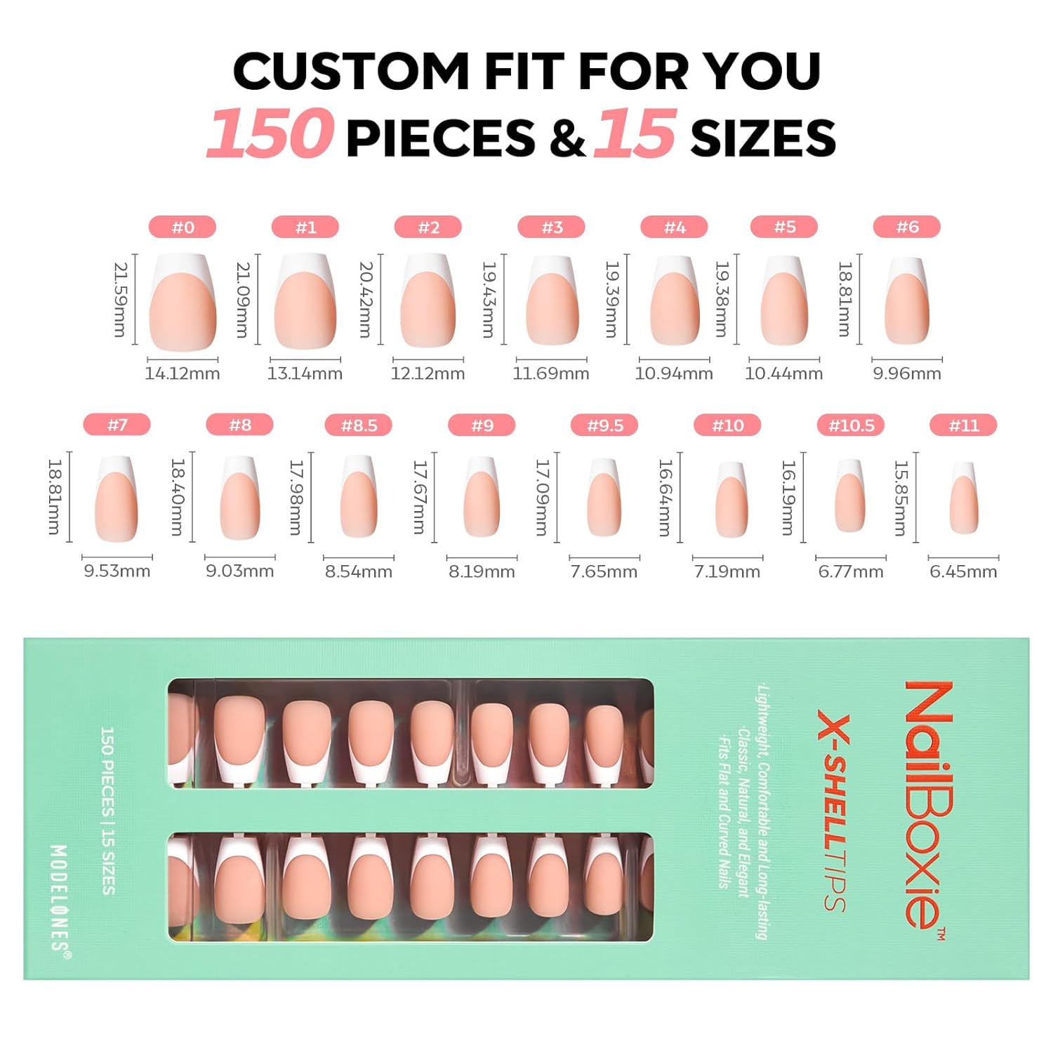 - French Tip Press on Nails Set: Upgraded classic French manicure style kit includes 150 pieces in 15 sizes for a perfect fit on your nail beds. Works beautifully on all nail types, including short and flat nails.