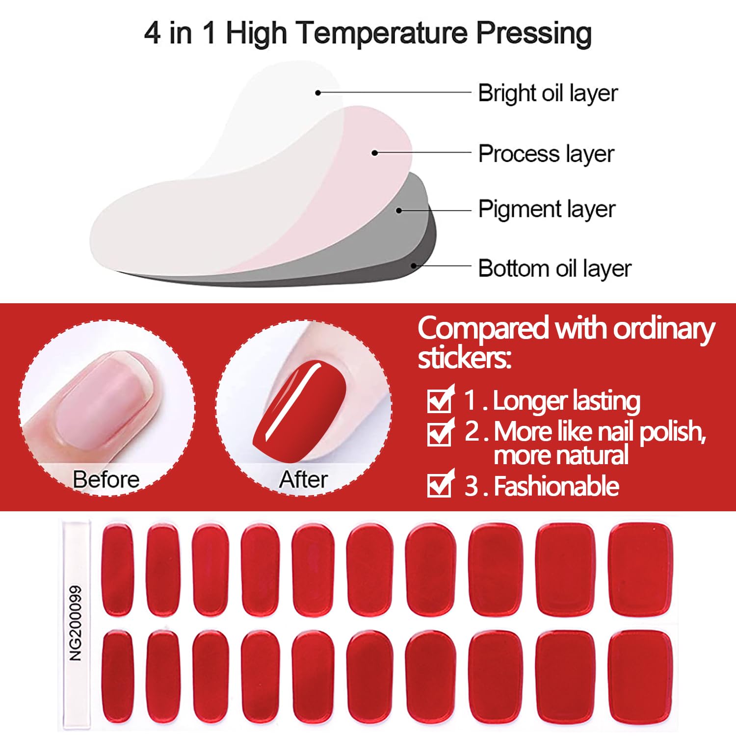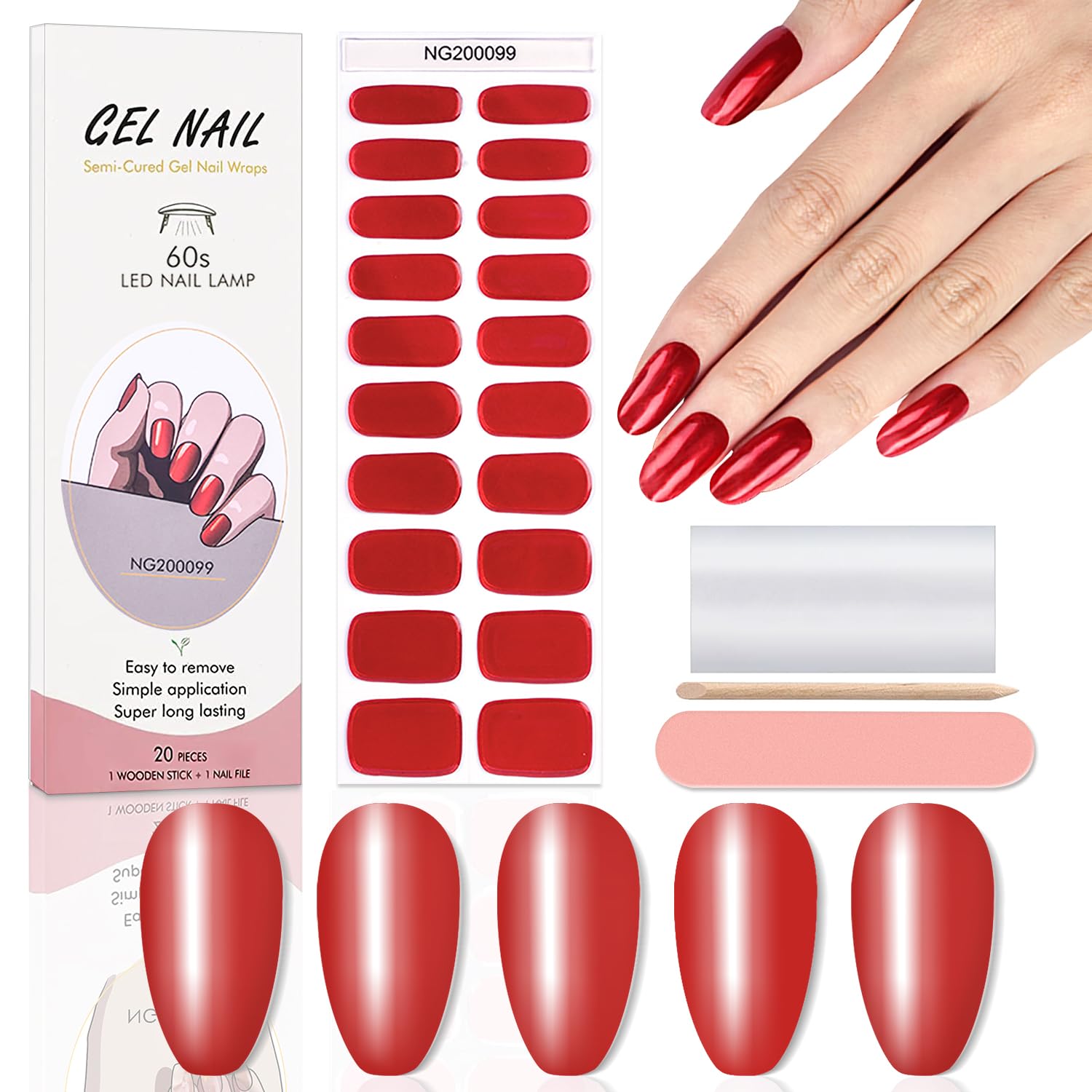 - [ 20 GORGEOUSLY THICK NAIL POLISH STRIPS ] - Package Content 20 Tips Chrome Red Semi cured nail polish stickers with 10 different sizes to ensure that fit for the most of nails, if you are good at use sissors, you can also cut the tips too big to be the size fitted, or share this good products with family or friends.