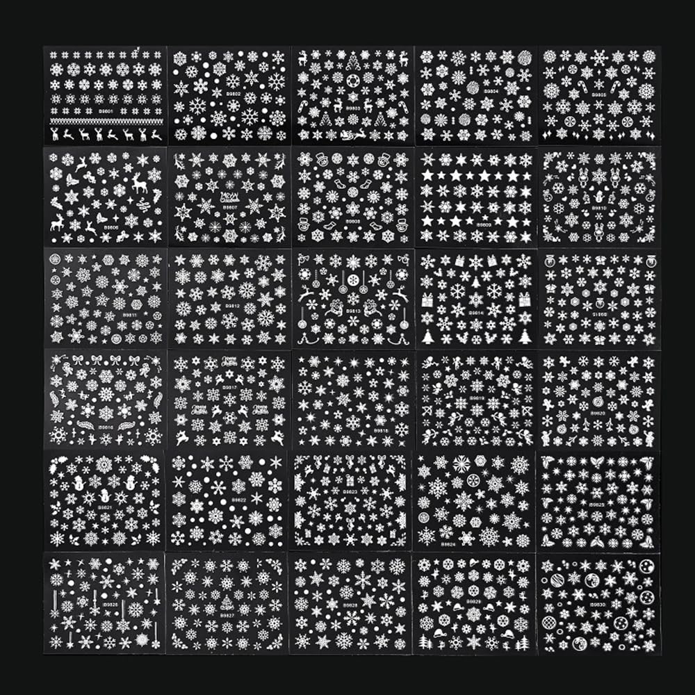 - ăQuantityăYou will get 30 sheets 3D white Christmas snowflake nail art decals, each paper measures 2 x 2.4 inches(5 x 6 cm). Contains a variety of Xmas snow patterns, Snowflakes of various shapes nail stickers are perfect for matching other Xmas nail art.