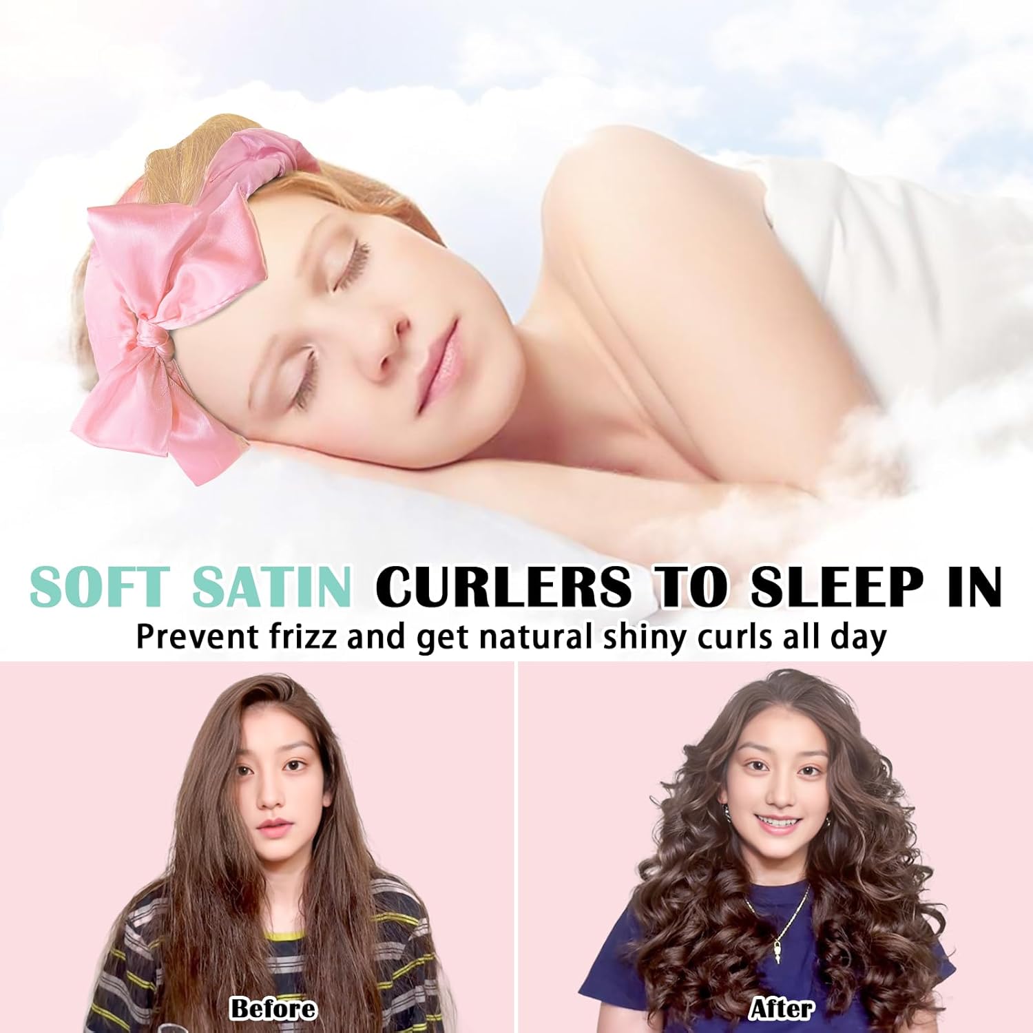 Satin Heatless Curls Overnight Hair Curlers to Sleep In Hair Curler Rollers No Heat Hair Wrap for Curls Headband, 70" Satin Heatless Curling Rod Set for Women Long Waves Hair Volume -Pink 9PCS