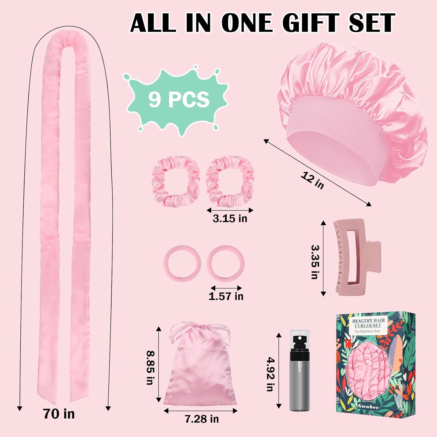- Thoughtful Set for Women: Our heatless curling set includes 9 items: 1 x 70-inch long satin curling rod headband, 1 x satin hair bonnet for sleep, 1 x hair clip, 2 x satin hair ties, 2 x elastic hair ties, 1 x satin storage bag, and 1 x spray bottle. This all-in-one curling rods set is packaged in an exquisite box, making it the perfect present for your wife, mother, daughter, friends, or colleagues
