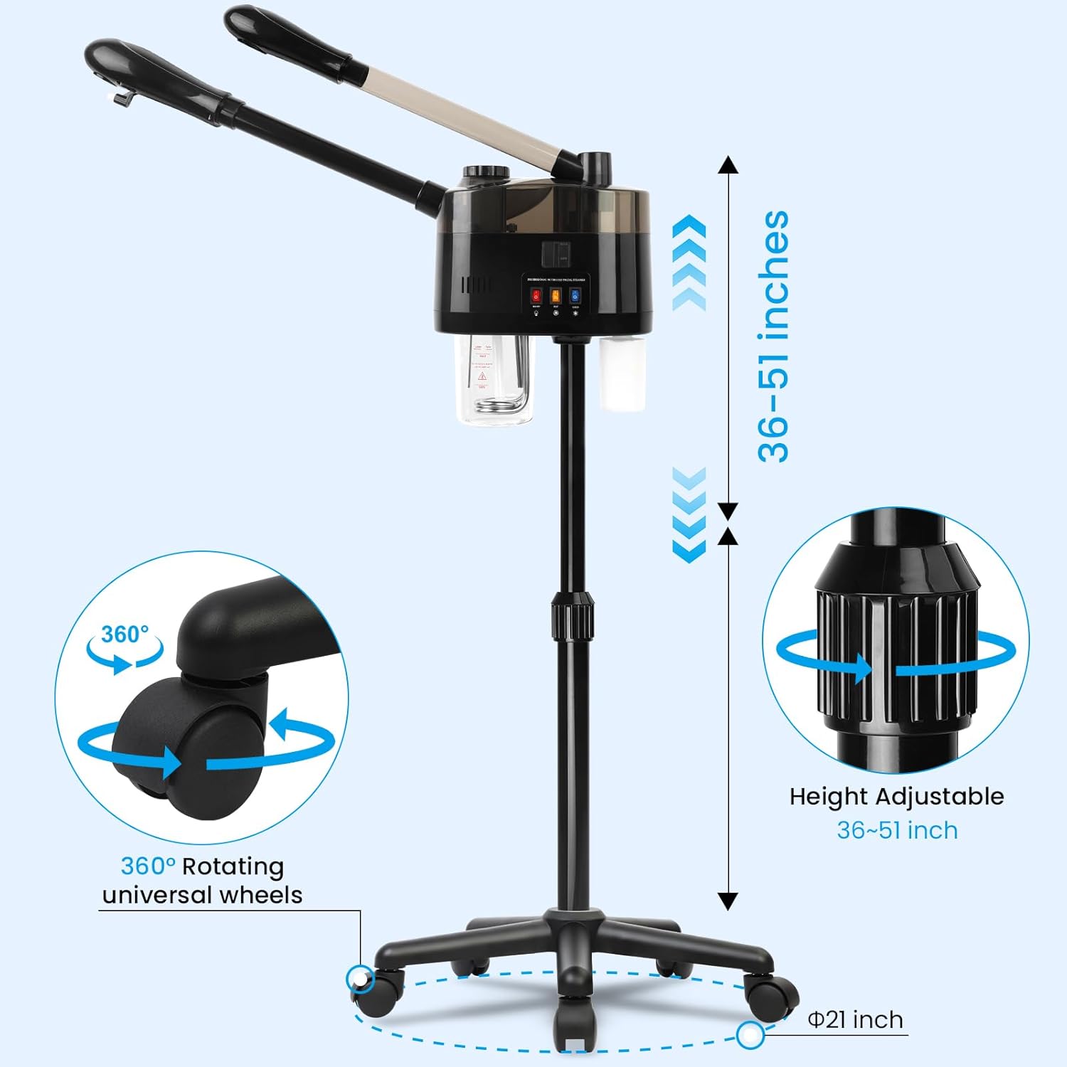 - 【Facial Steamer Adjustable】The height of this professional facial steamer can be adjusted from 36~51 inches, 360° rotatable nozzle, 360° rotatable main body, Keep the nozzle at least 25~30 cm (9~11 inches) away from your face, when using and the best steaming time is 15-20 minutes.