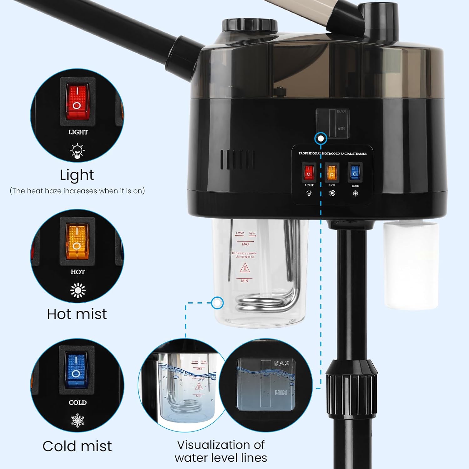 - 【Facial Steamer for Esthetician】Facial steamer is easy to operate, excellent materials, high heat resistant and no rust, New upgraded hot and cold nozzle, essential oil sticks and scent box design, perfect for beauty salon, spa, and at home.