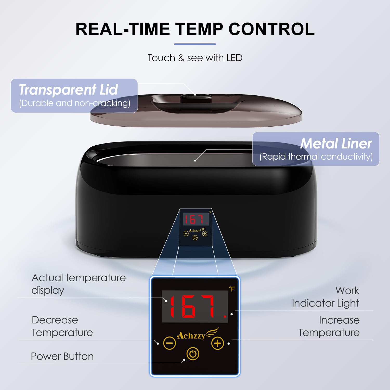 - SMART TEMPERATURE CONTROL WITH LED DISPLAY–The Achzzy hand wax paraffin machine features intelligent temperature control technology and an LED screen that displays real-time temperature updates. This allows you to easily set and maintain the perfect temperature for your wax treatments, ensuring a safe and comfortable experience. The LED screen provides clear and accurate temperature readings, allowing you to monitor the progress of your wax melting and adjust the temperature settings as needed.