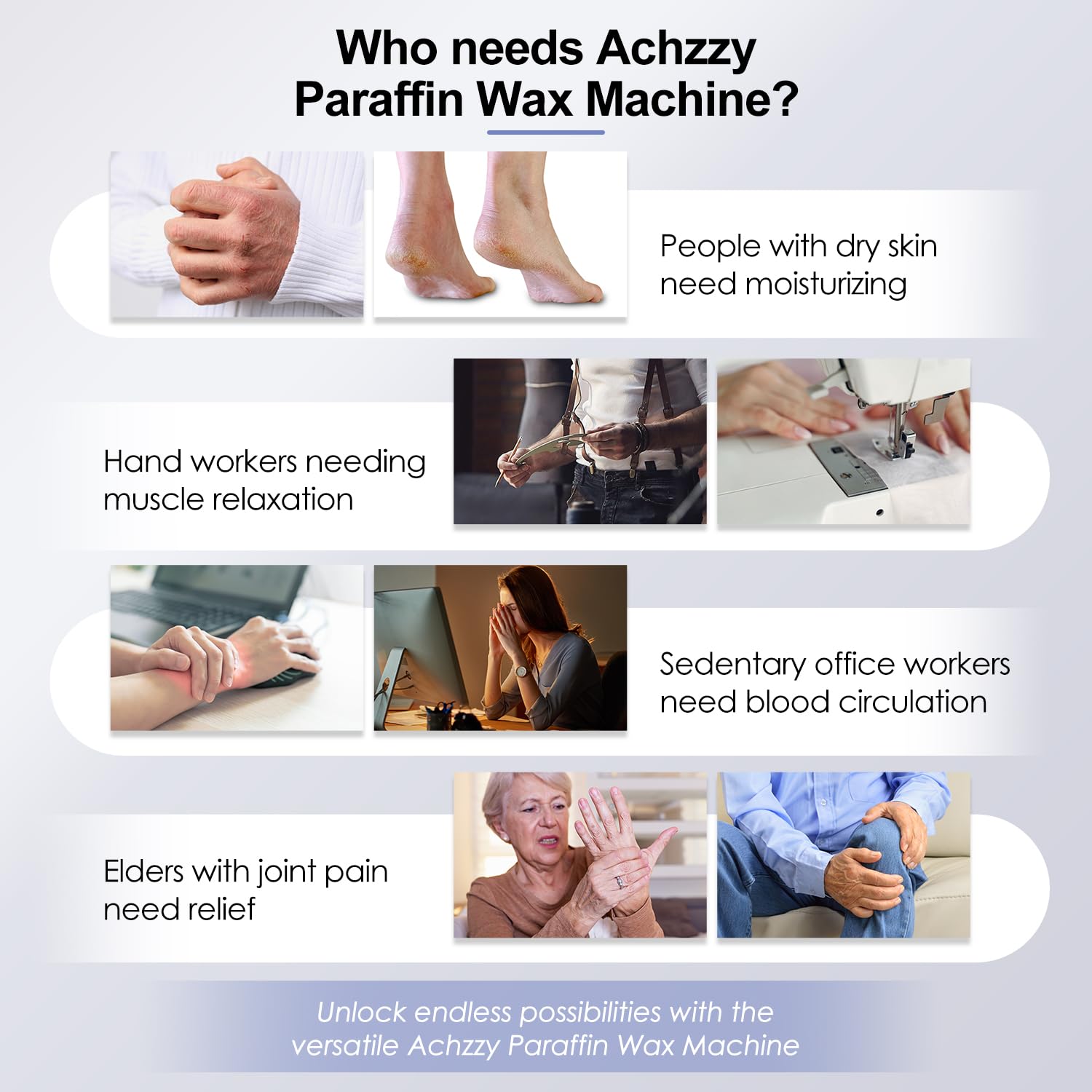 - DEEP MOISTURIZING TREATMENT FOR HANDS AND FEET–Designed for professional-quality care, the Achzzy paraffin bath deeply hydrates and nourishes your skin, leaving your hands and feet feeling soft, smooth, and rejuvenated after each use.