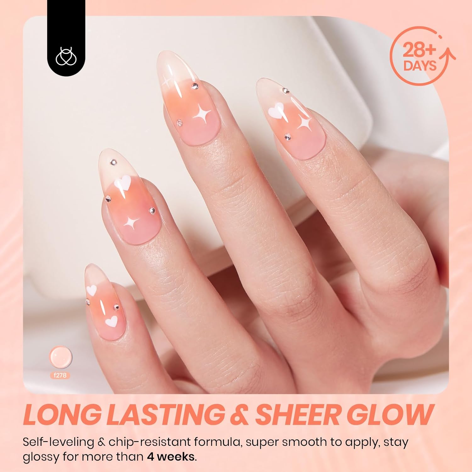 - 【Orange Jelly Sheer Gel 】Apply several layers to build up the color from clear translucent to solid opaque. Each layer, whether one, two, or three layers, creates a different effect. This nude color jelly gel polish is UV gel and need to be cured 60-120s. (Note: It must be used with a base coat and top coat, which are not included and need to be purchased separately)