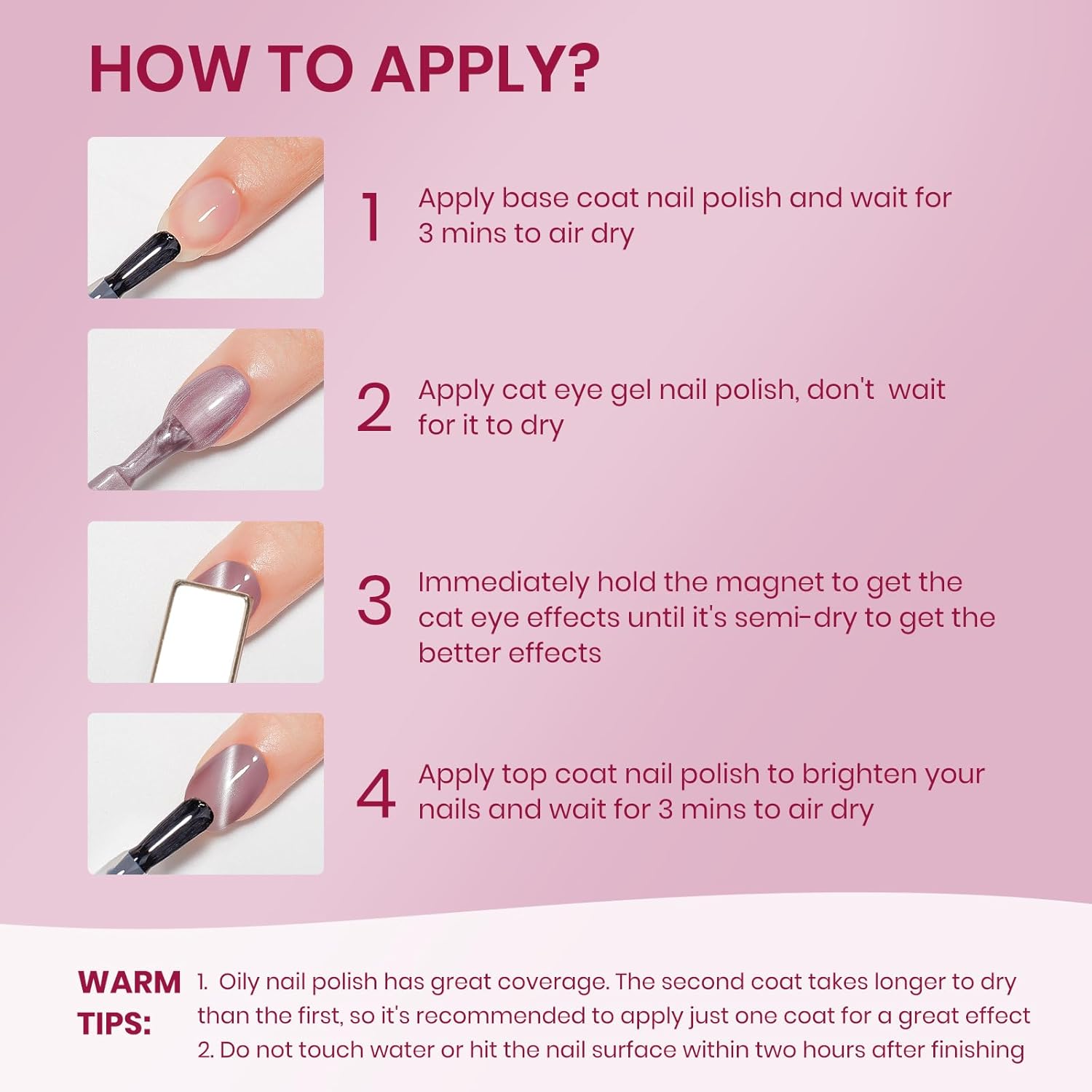 - Important Tips: 1. When the nail polish is not dry yet, it will be fluid. Use magnets to hold it in place until it's semi-dry, then take them off for a sharp cat-eye look 2. Do not touch water or hit the nail surface within two hours after finishing to avoid peeling; 3. Base and top coat nail polish art necessary