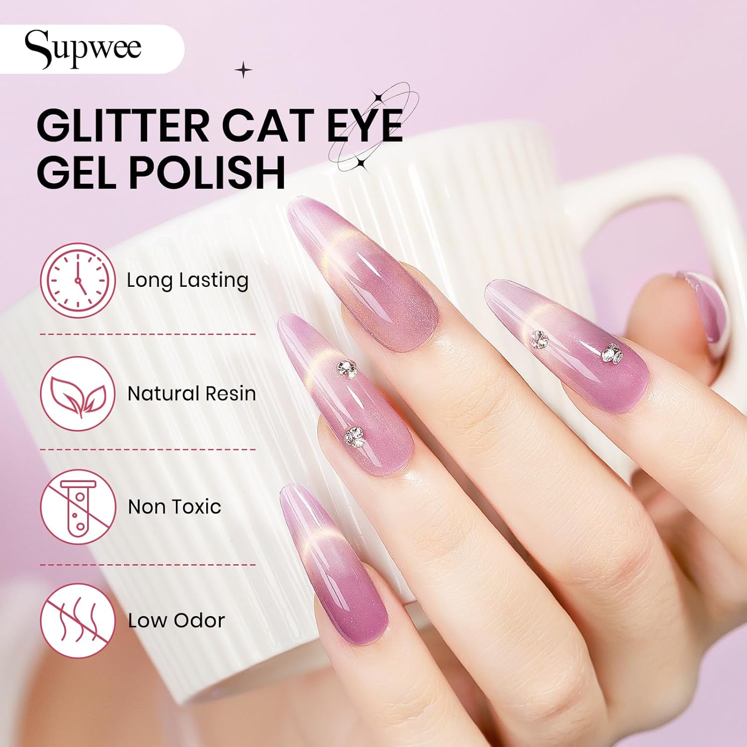 - Daybreak Cat Eye Gel Set: This latest cat eye gel nail polish set includes shades like silver, pink,puple blue and green. Each color is carefully selected to suit different occasions and moods, keeping your nails stylish and elegant at all times