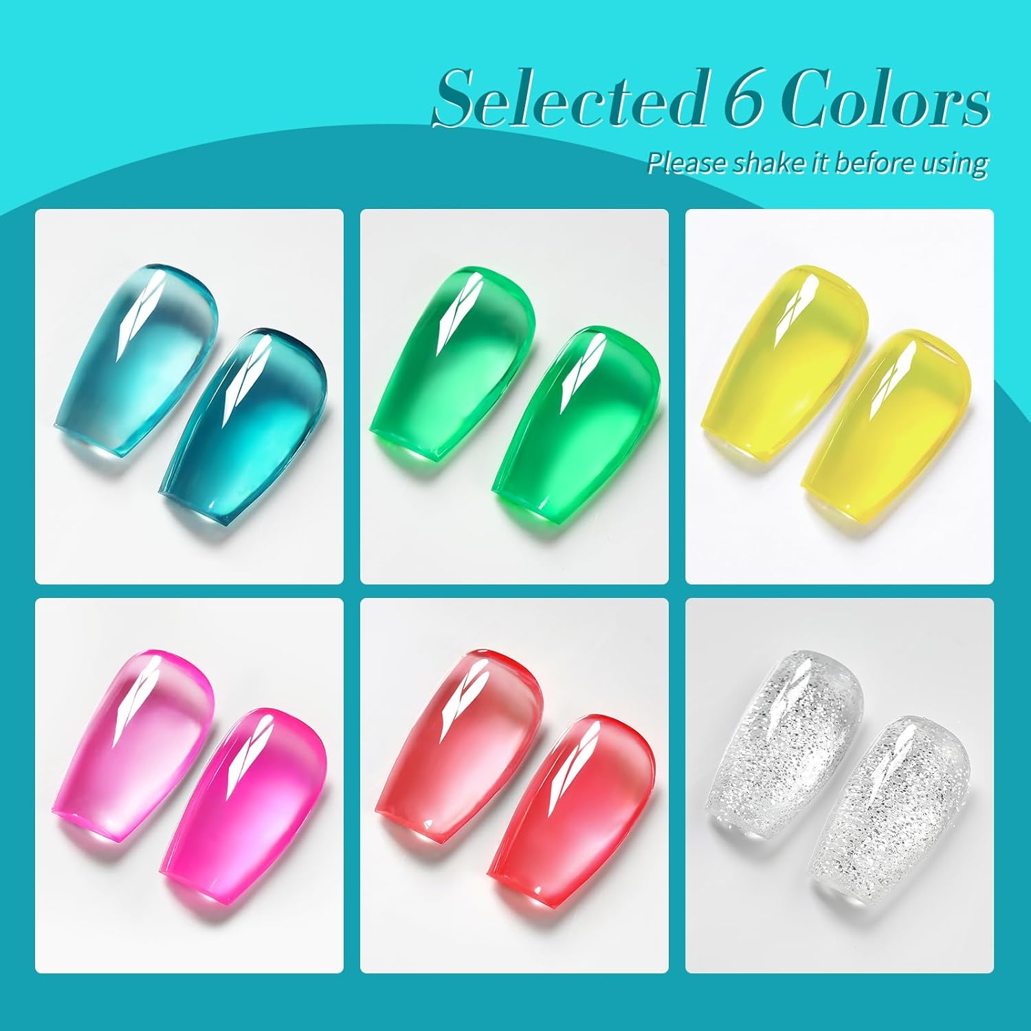 - PACKAGE CONTENTS: 5 Bottles neon jelly gel nail polish with 1pc silver platinum glitter gel polish.Include Blue Green Pink Red Yellow Silver Colors.A set of gel polish allows you to try multiple different effects.You can DIY various nail art styles.Use as regular color gel,blooming gel effect,gradient effect.