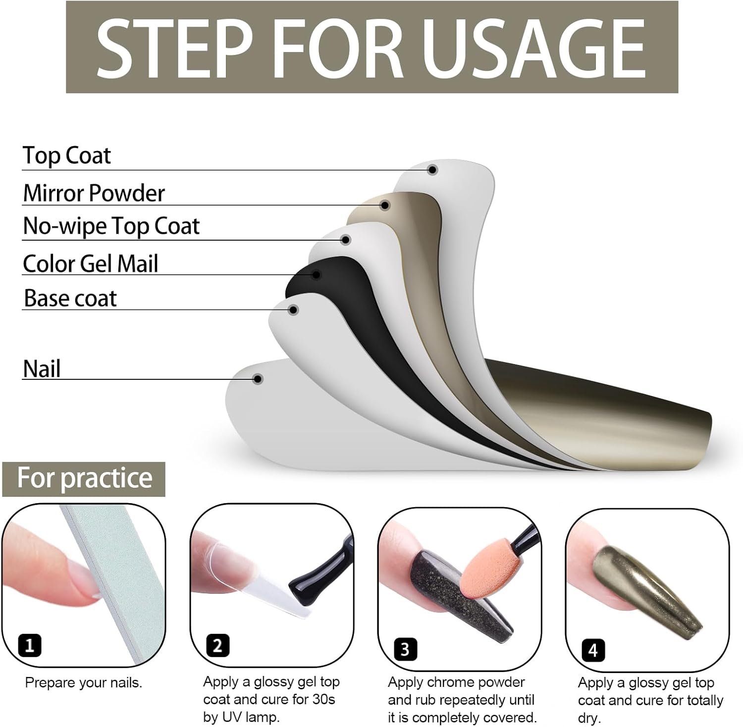 - The Scope Of Application:All chrome powders should only be applied to glossy No wipe top coat to embellish Nail-Polishes color. Otherwise it is unusable, it can't be applied directly to the nail, and it can't be applied directly to the skin. Artdone chrome powder can be applied on UV gel nails, acrylic nails or false nail tips. You can use them very easily