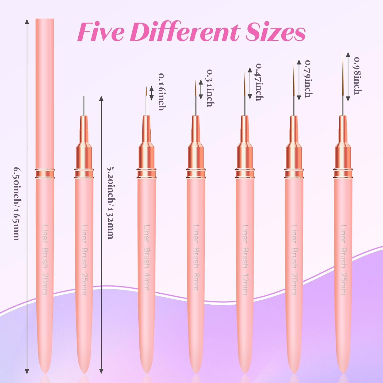Liner Brush for Nails, 5Pcs Thin Nail Art Brushes Professional Nail Detail Brush for Gel Polish Sizes 4/8/12/20/25mm (Pink)