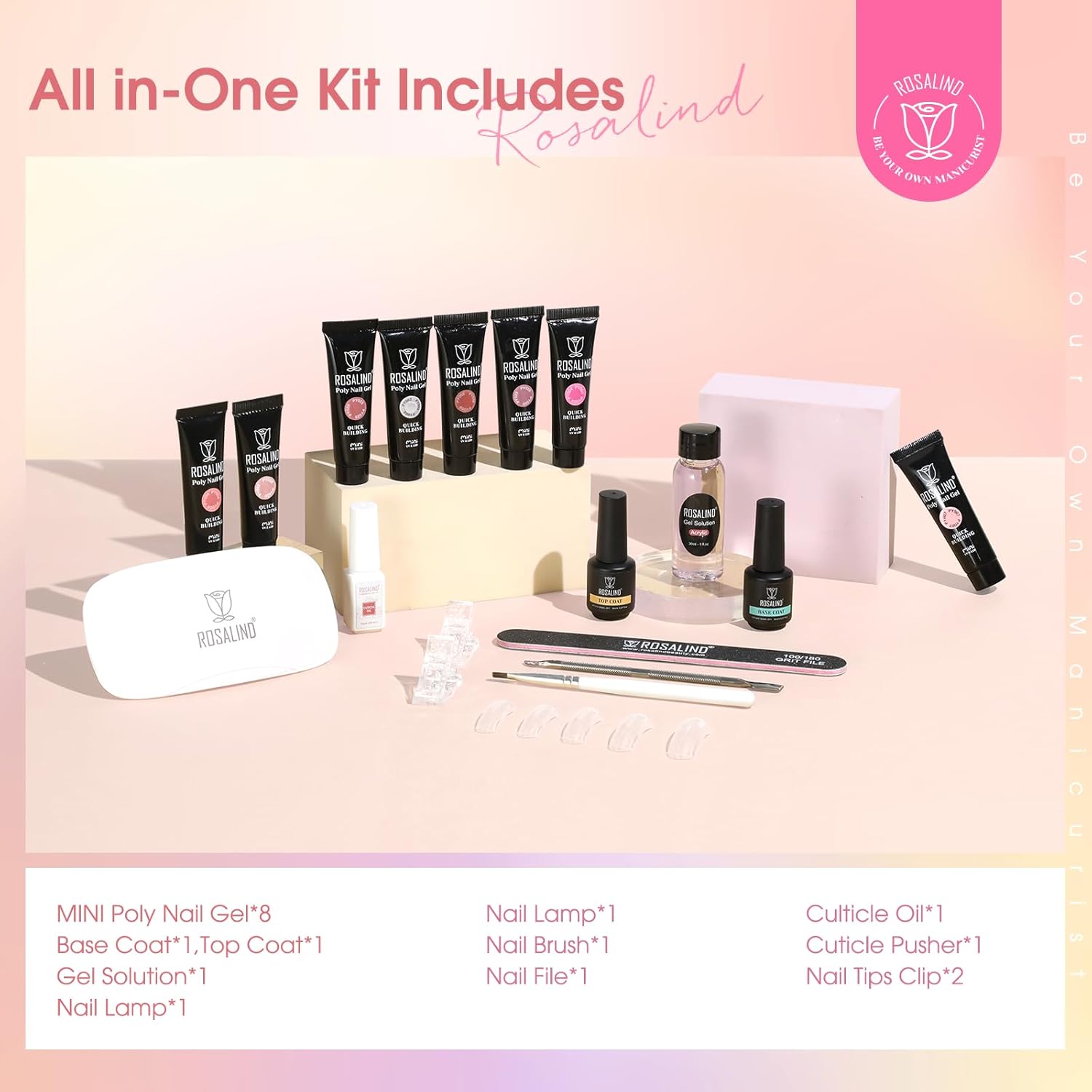 - Poly Nail Gel Colors Kit: ROSALIND poly nail gel colors kit contains 8pcs poly nail gel(per/10ml), 1*mini nail lamp, 30ml slip solution,1*base coat, 1*top coat, 1*cuticle oil, and other nail decoration etc
