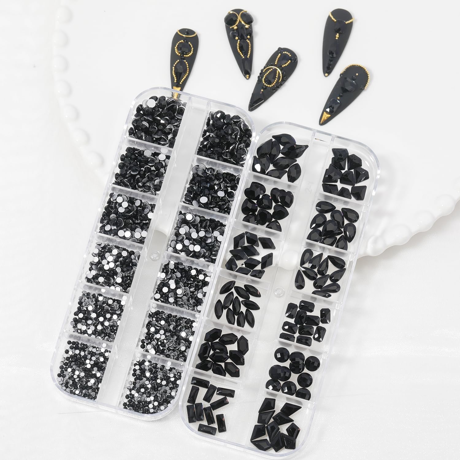 - ★Crystal Black Rhinestones and Gems - contains 2 boxes of nail art rhinestones, about 2800 pieces of mineral gold flat back nail rhinestones, 120 pieces of multi-shape nail gem rhinestones, 1 tweezer, 1 piece of rhinestone pen and 6 sizes round nail art rhinestones are 1.8mm, 2mm, 2.5mm, 2.8mm, 3mm, 4mm, different sizes of mixed crystal rhinestones can match different nail art styles.