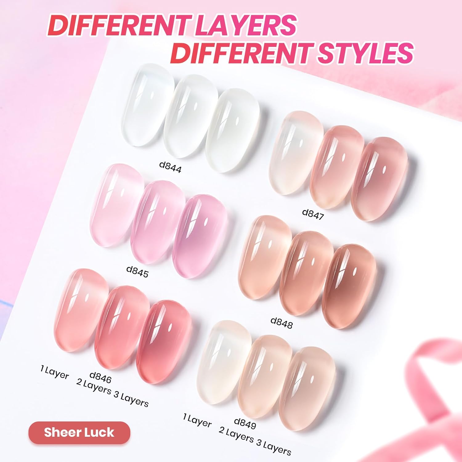 - 【Sheer Nude Pink Gel 】Apply several layers to build up the color from clear translucent to solid opaque. Each layer, whether one, two, or three layers, creates a different effect. This milky white nude pink jelly gel nail kit is UV gel and need to be cured 60-120s. (Note: It is still sticky after curing and must be used with a base coat and top coat, which are not included and need to be purchased separately)
