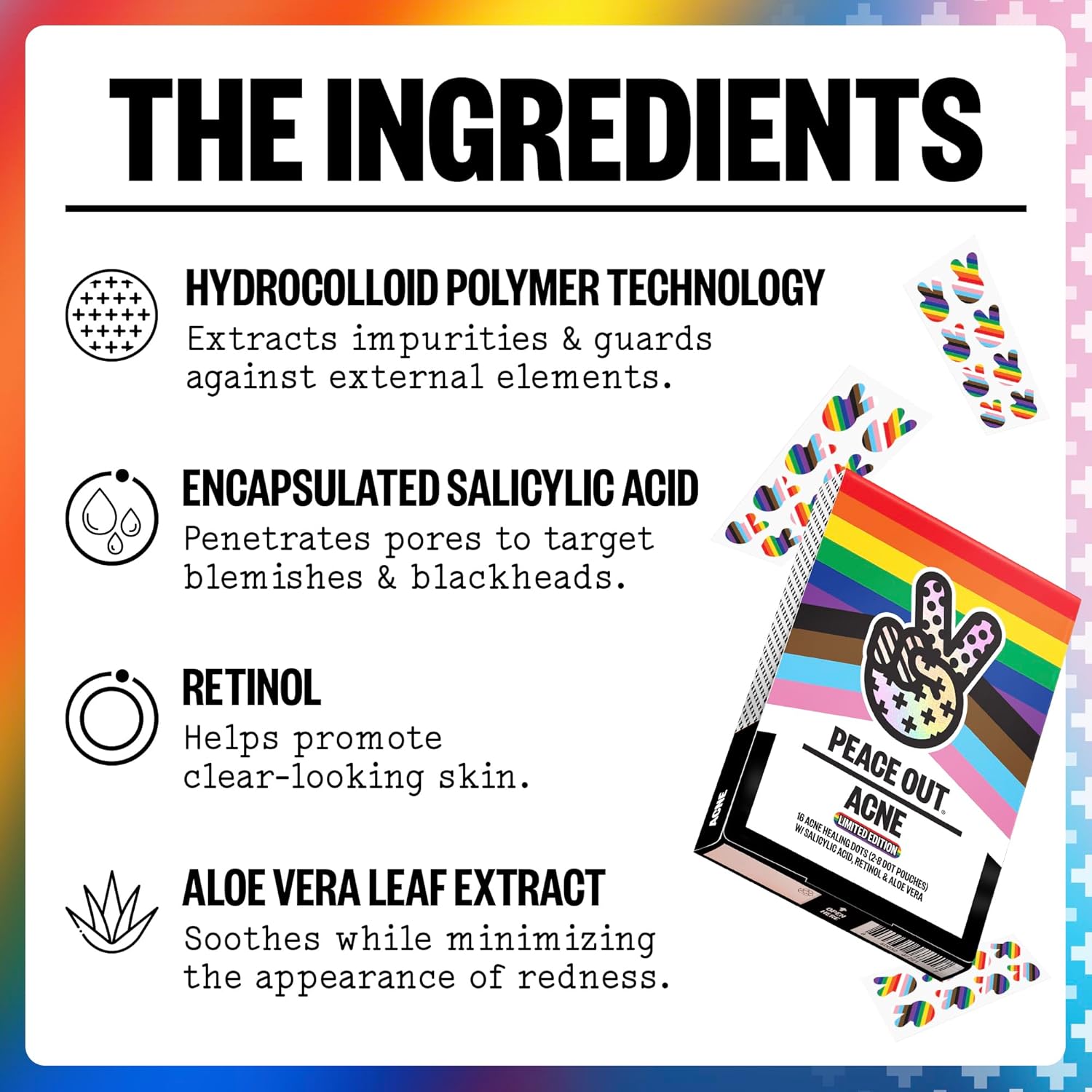 PEACE OUT Acne Healing Pride Dots Helps Clear Blemishes Overnight, Fast Acting Hydrocolloid Pimple Patches for Breakouts with Salicylic Acid, Retinol and Aloe Vera, Award Winning Skincare 16 Count