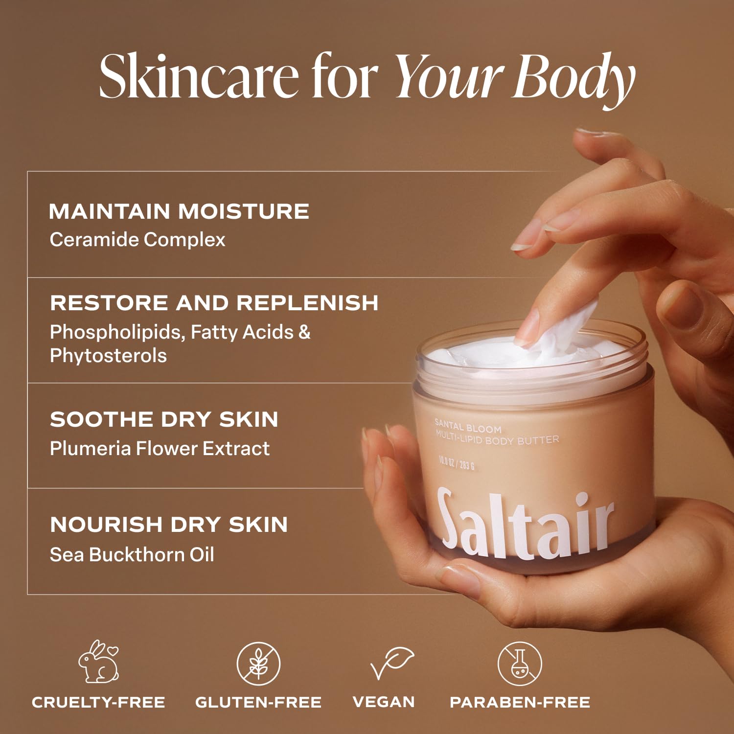 - GOOD FOR SKIN: Your new body butter comes in a 10oz jar. All our products are cruelty-free, gluten-free, vegan, and paraben-free. Everything we create is made with a body-positive vibe. Saltair - Body Care is Skin Care. Every Body is Welcome Here
