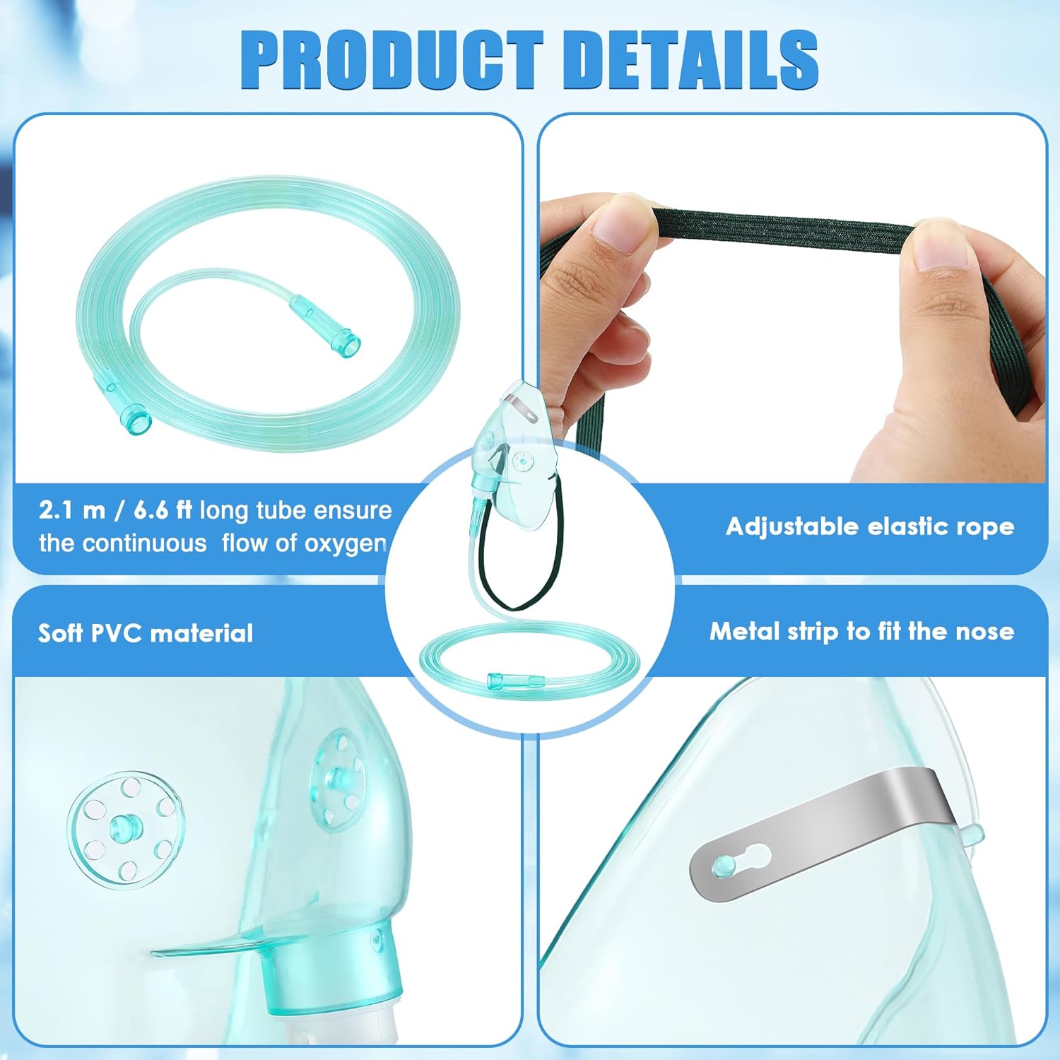 - Thoughtful Design: The oxygen mask for adult comes with an adjustable elastic headband that suits different head sizes, ensuring a safe, comfortable fit without slipping. It is further enhanced by a malleable nose clip that allows for precise adjustment of the nose profile, proper sealing to ensure optimal oxygen delivery, and a 7 foot anti kinking tube that allows for barrier free movement and consistent oxygen flow; This feature also helps prevent oxygen leaks, maximizing efficiency