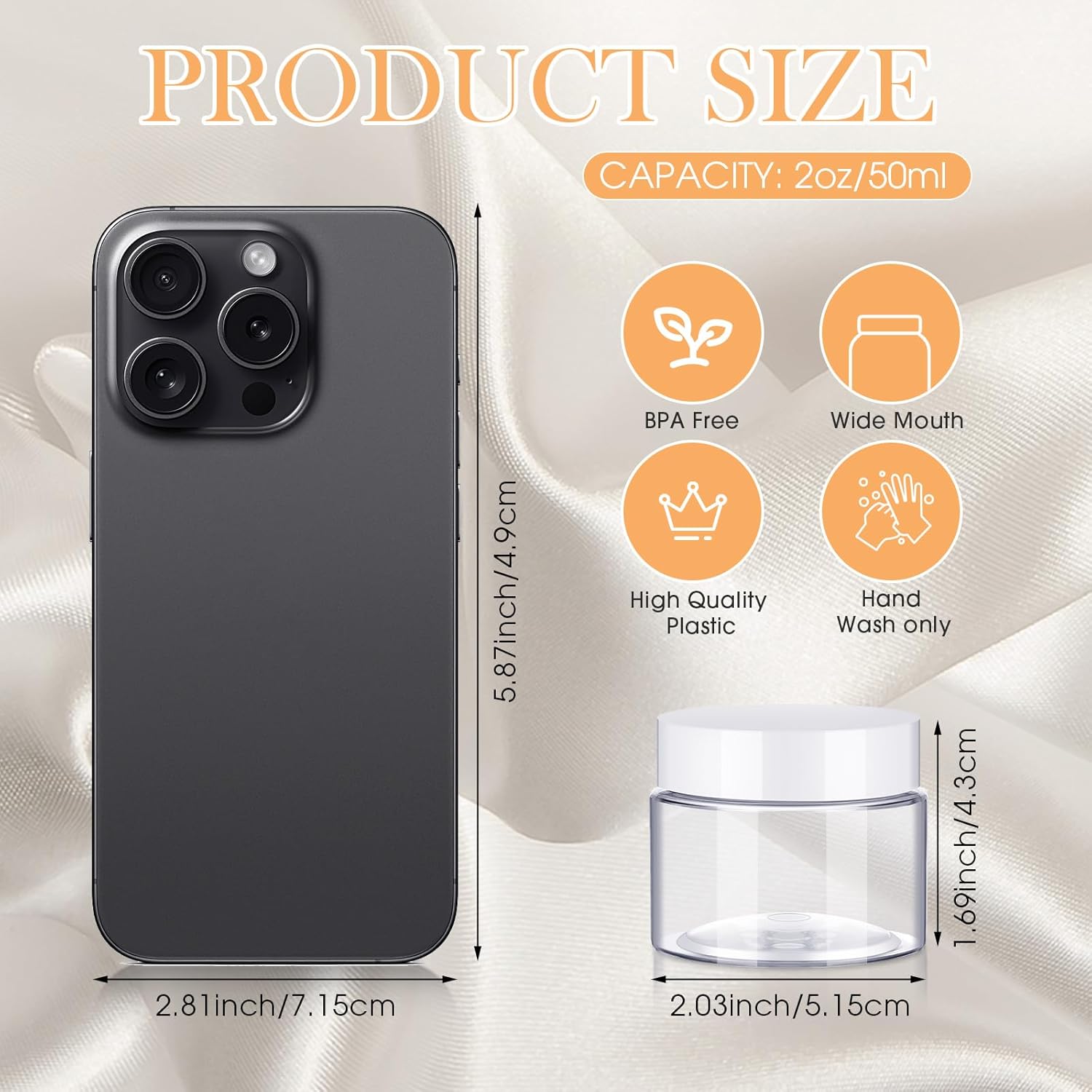 - Package Includes: 100 pieces of 6 oz plastic containers with lids, each small plastic jar is about 6.2 cm / 2.44 inches in diameter, about 7.1 cm / 2.8 inches tall, and holds 2 oz, each small plastic jar weighs only 15 grams; The large quantity is convenient for your multiple purposes, suitable for packing and carrying cosmetics at home or travel