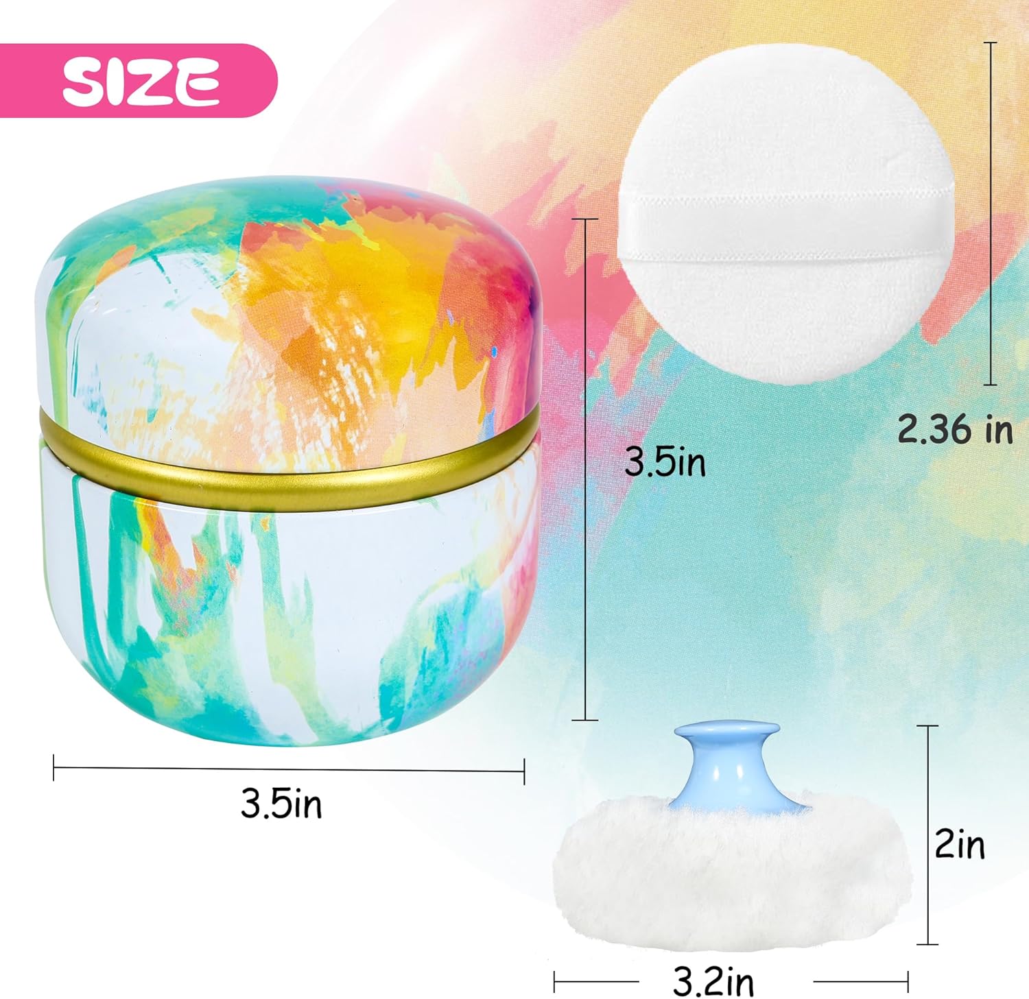 - Size: The powder box is 3.2" diameter/width.The powder puff is 3.15"/8cm in diameter and 2"/5cm in height.The small powder puff is 2.36"/6cm in diameter.