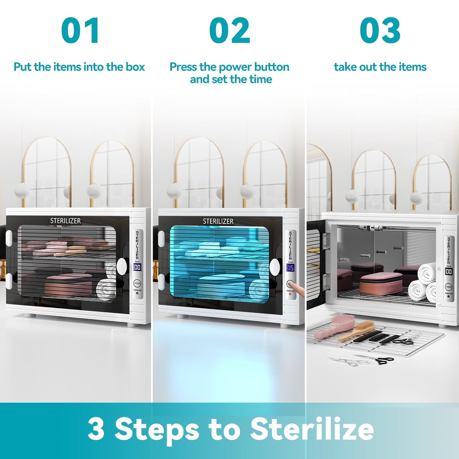 - Wide range of applications: The U&V Care Cabinet is not only suitable for home use, but can also be used in salons, barber stores, tattoo parlors, nail salons and beauty salons. It can clean Salon Tools, Nail Clippers, Cell Phones, Watches, Glasses, Baby Toys, Makeup Tools, nail tweezers, eyebrow scissors, towels, tableware, plastic tools, makeup, jewelry, earbuds, keys, pacifiers, toothbrushes and more.