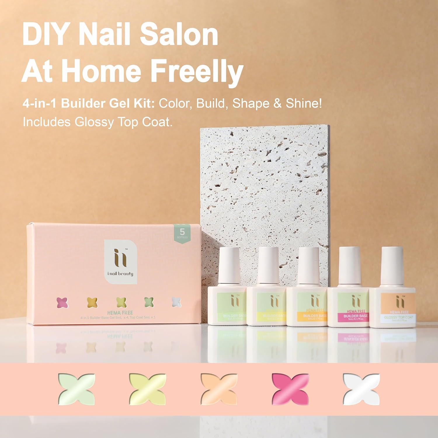 - WHAT YOU GET: 4 bottles of 4 in 1 builder rubber base gel polish with 1 top coat, Can be used as nail gel, base coat, builder gel and nail strengthening paint: In cold weather, the nail base coat gel will become thicker, which is normal. Before applying, you can put the bottle in warm water for a while to get a better consistency.