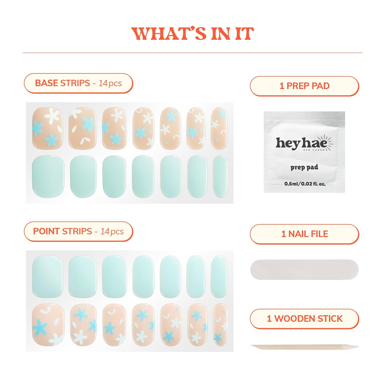 - Enjoy a complete package of fresh salon quality nails done at ease everywhere and anywhere you go! Package includes: 28 strips, 1 Prep pad, 1 Nail file, & 1 Wooden stick.