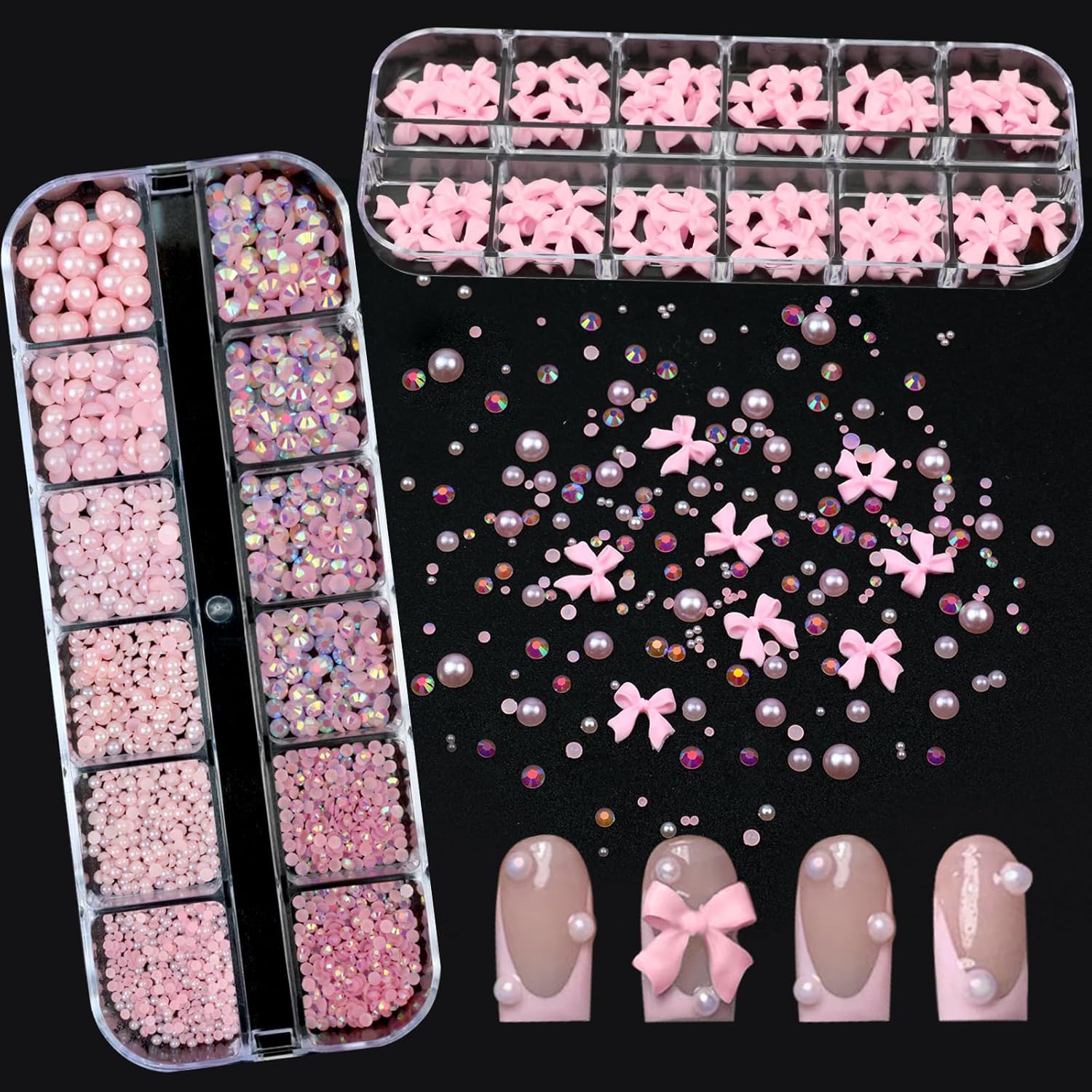 - 【Exquisite Design】Different sizes of nail rhinestones and nail pearls paired with pink nail glitter and bows nail charms are our meticulously designed combinations. I believe they can meet your daily nail decorations needs and are the best choice for nail design.