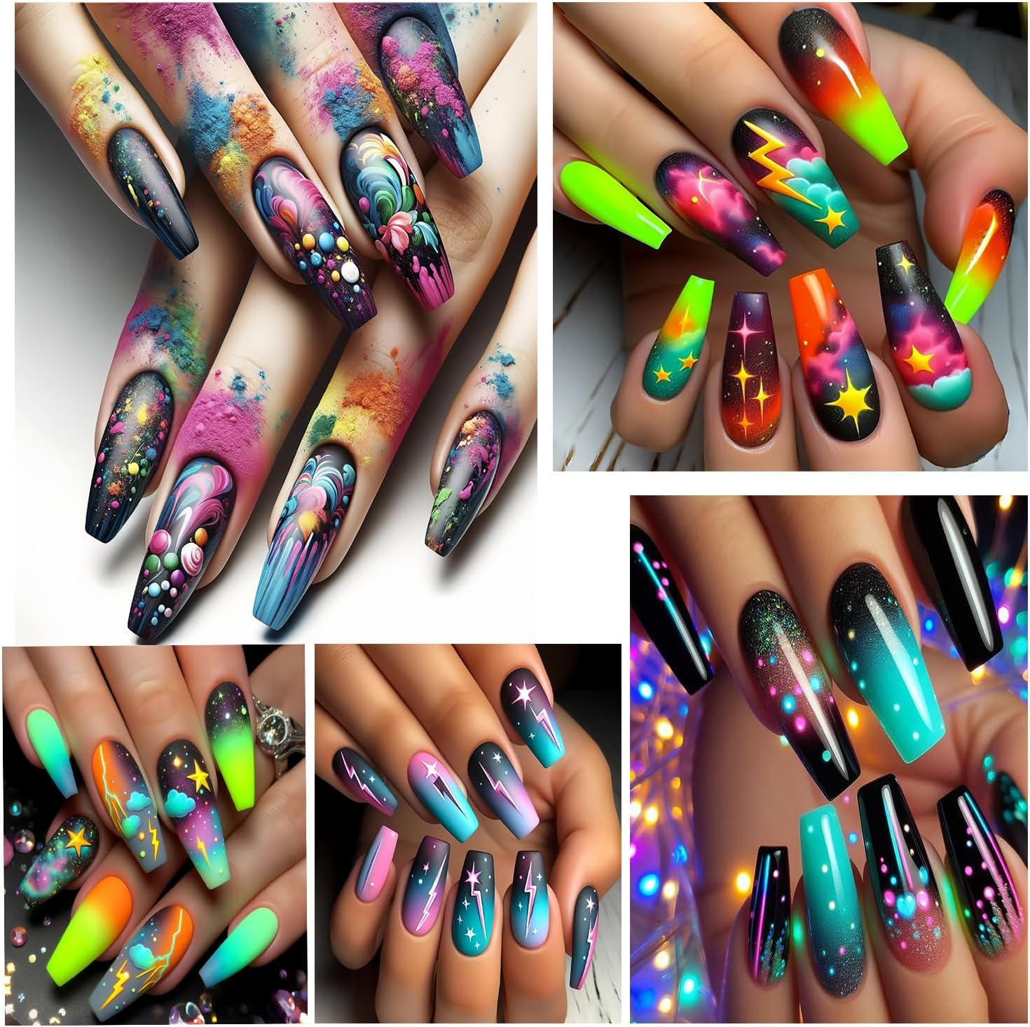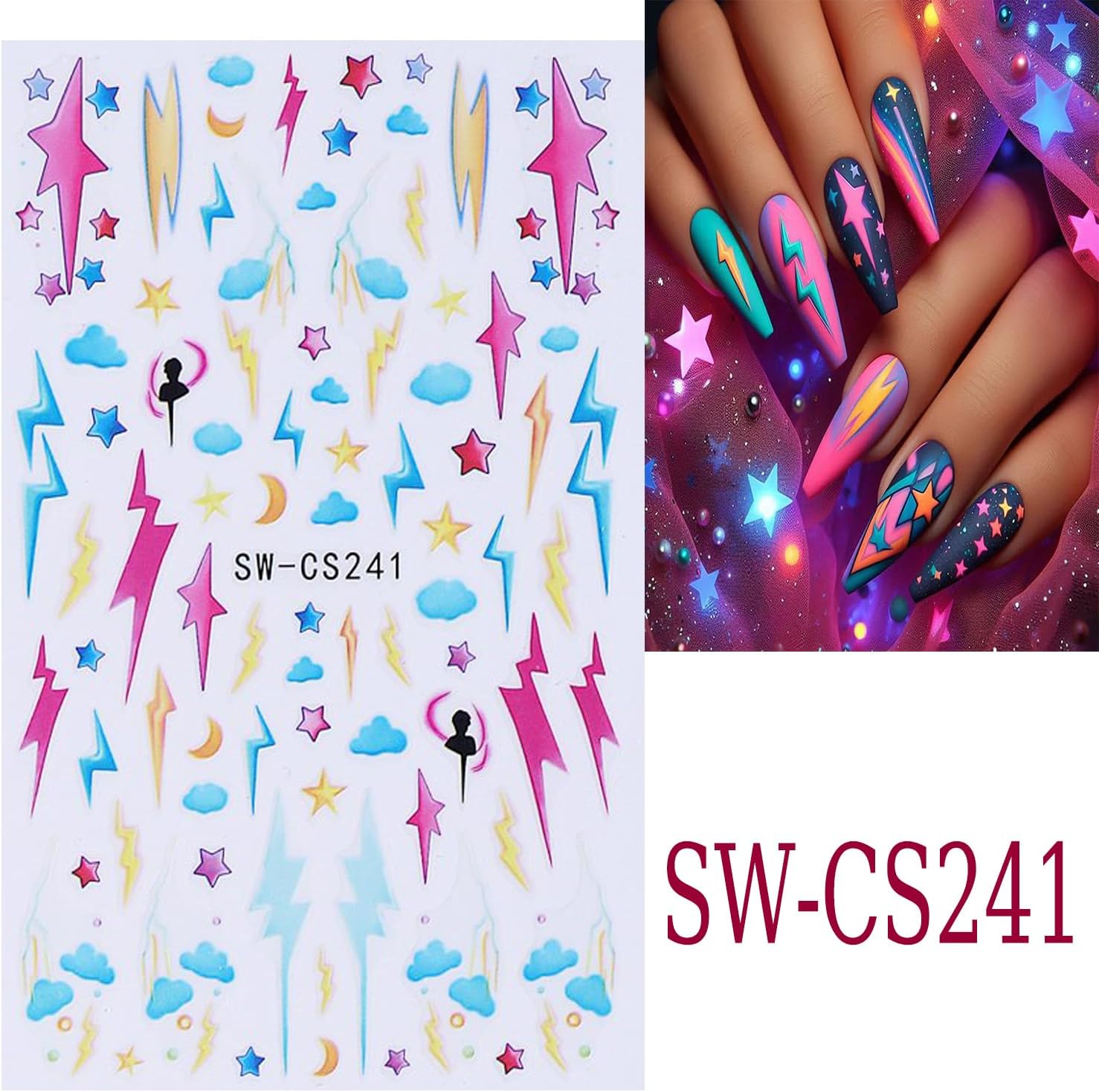 - QuantityďźYou will get 6 sheets lightning lines nail art adhesive stickers, each paper measure 3.5 x 2.5 inches(9 x6.5 cm). Different colors lightning, lines, stars, clouds patterns for your choice, these nail stickers are perfect for matching other nail art