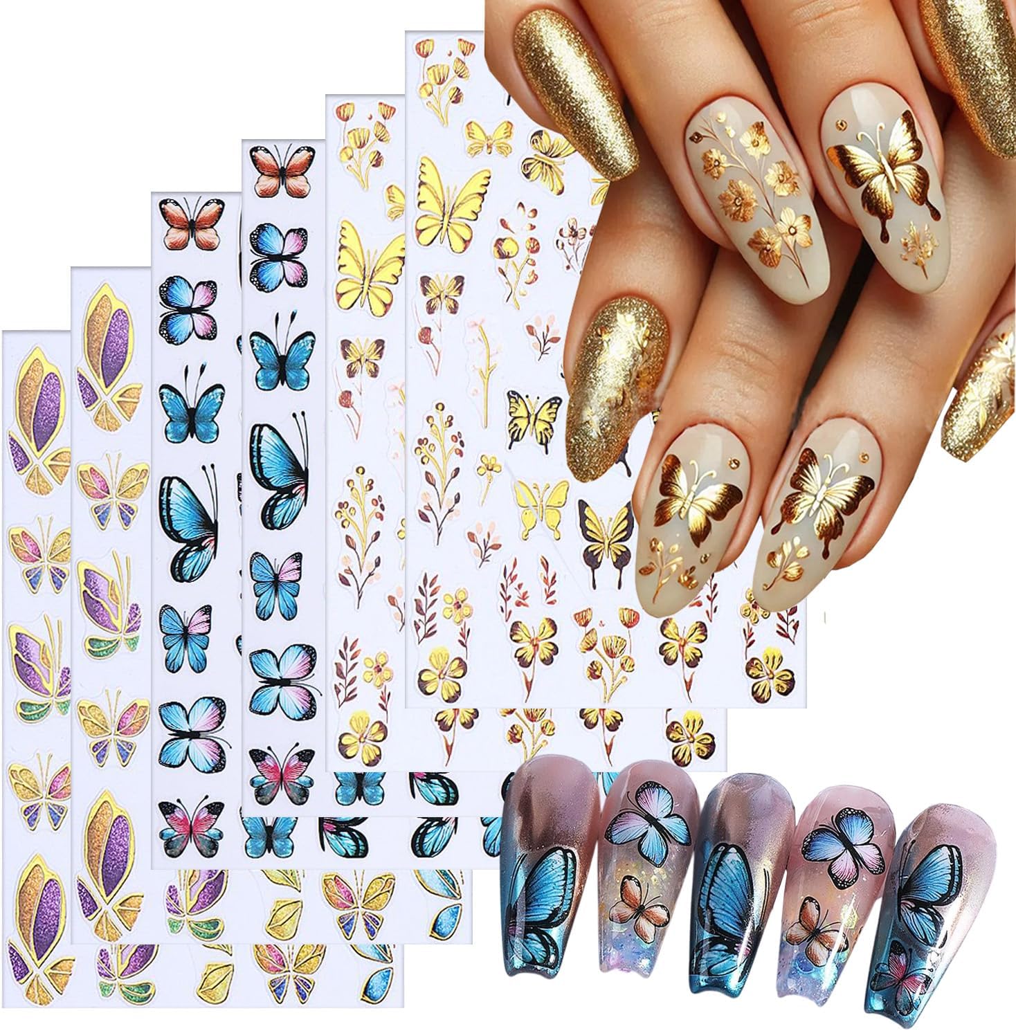 - QuantityďźYou will get 6 sheets butterfly nail art adhesive stickers, each paper measure 3.5 x 2.5 inches(9 x6.5cm). Gold blue butterflies patterns for your choice, these nail stickers are perfect for matching other nail art