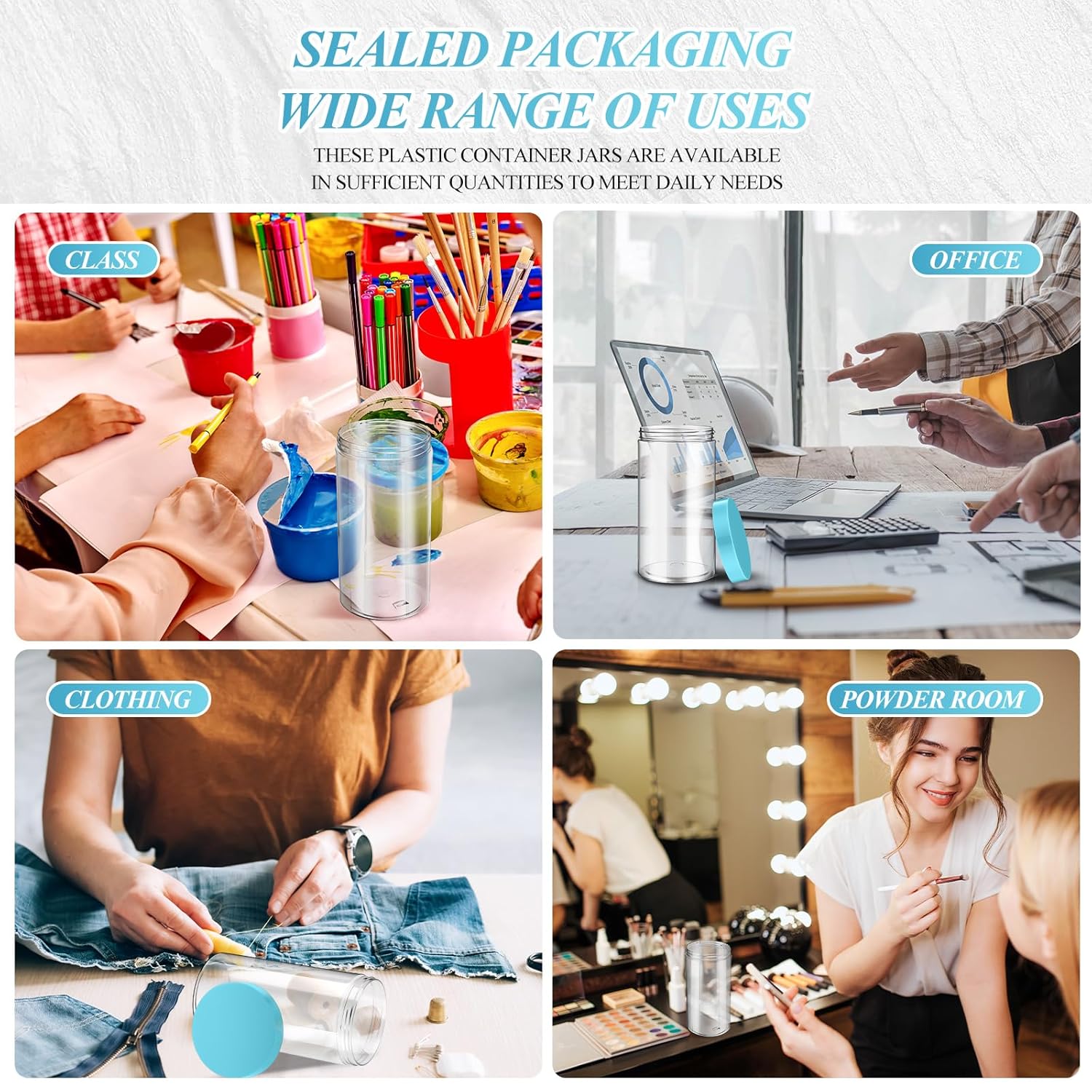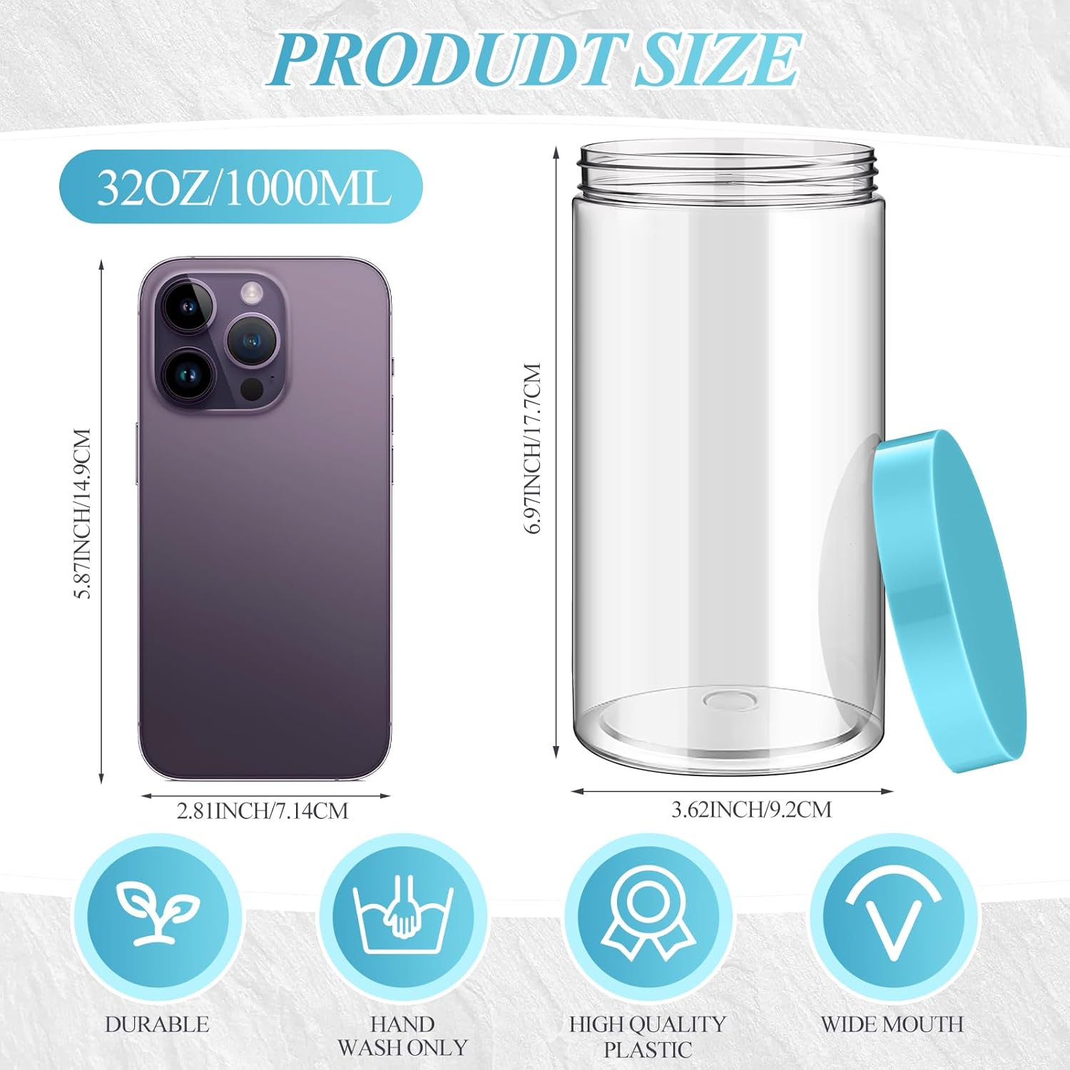 - What You Receive: there are 4 pieces plastic jars with blue screw-on lids; They are durable and refillable, measuring about 32 oz in capacity