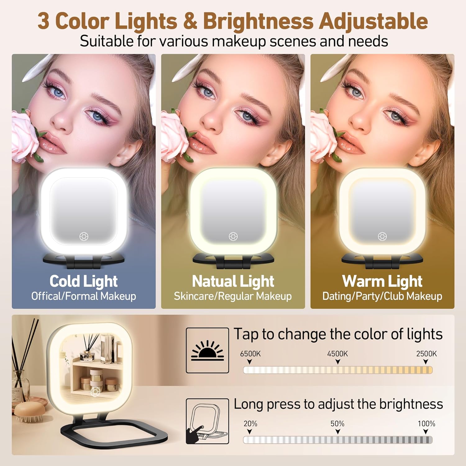 - 3 Color Light Modes & Stepless Brightness: This travel magnifying makeup mirror has built-in 44 high-brightness LED lamp beads, providing 3 colors and brightness adjustment. Short press the sensor switch to change the color and long press to adjust the brightness.meet all your needs in different environments