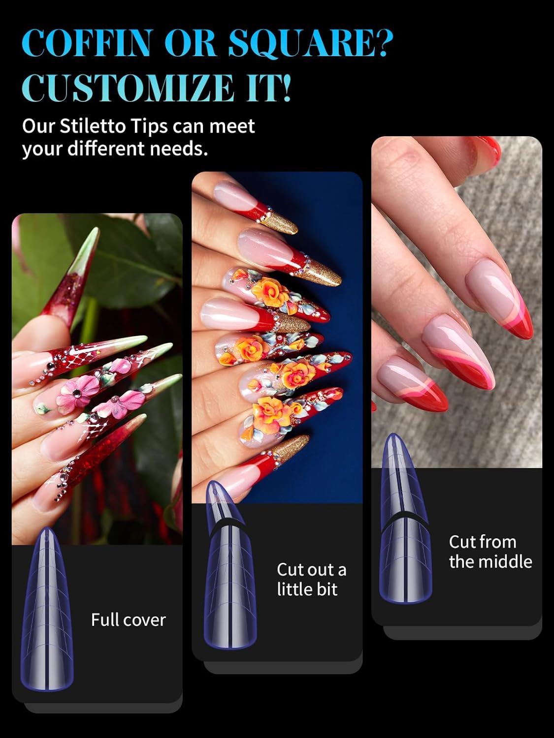- 【12 Sizes Suitable for All Nail Types】Both poly gel nail tips and French dual sticker silicone pads come in 12/8 style shapes and 12 sizes, each is engraved with numbers "0-11" for easy to recognize,which is convenient for you to design the nail length you want. And each size of long nail tips is separated by a small grid, a total of 12 grids, so they're easy and convenient to choose the suitable size to meet your nail's need.