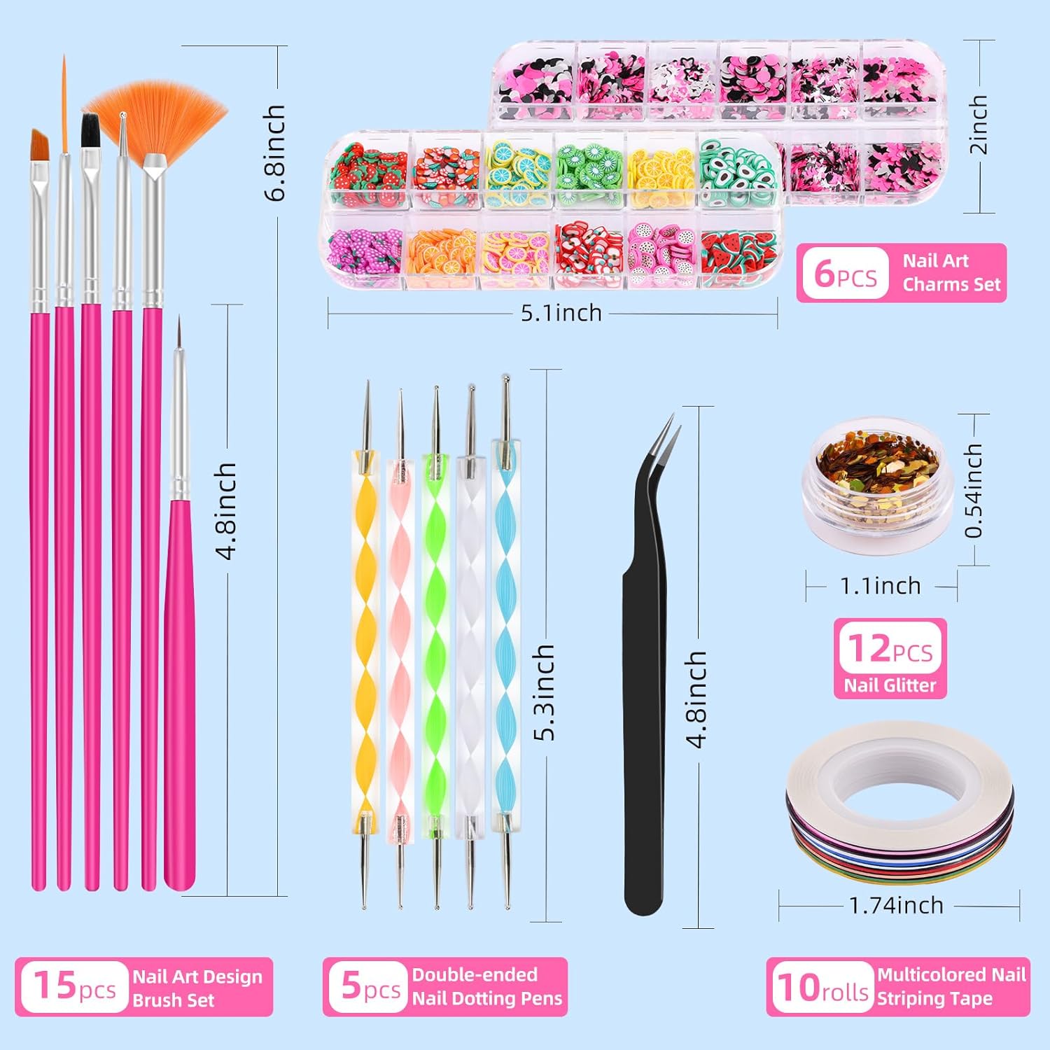 - Nail Art Decoration Kit: You will receive a nail art charms set, it contains 15pcs nail art brushes, 5pcs dotting pens, 10 colors of striped tape, 1 box 12 colors of nail art sequins, 5 boxes of mixed nail art glitters (flowers, butterflies, stars, love hearts, circles), 1 box fruit shaped slime pieces, and a pair of tweezers. This complete nail art set is perfect for nail art beginners and enthusiasts, it's easy to start a pleasurable nail art salon at home.