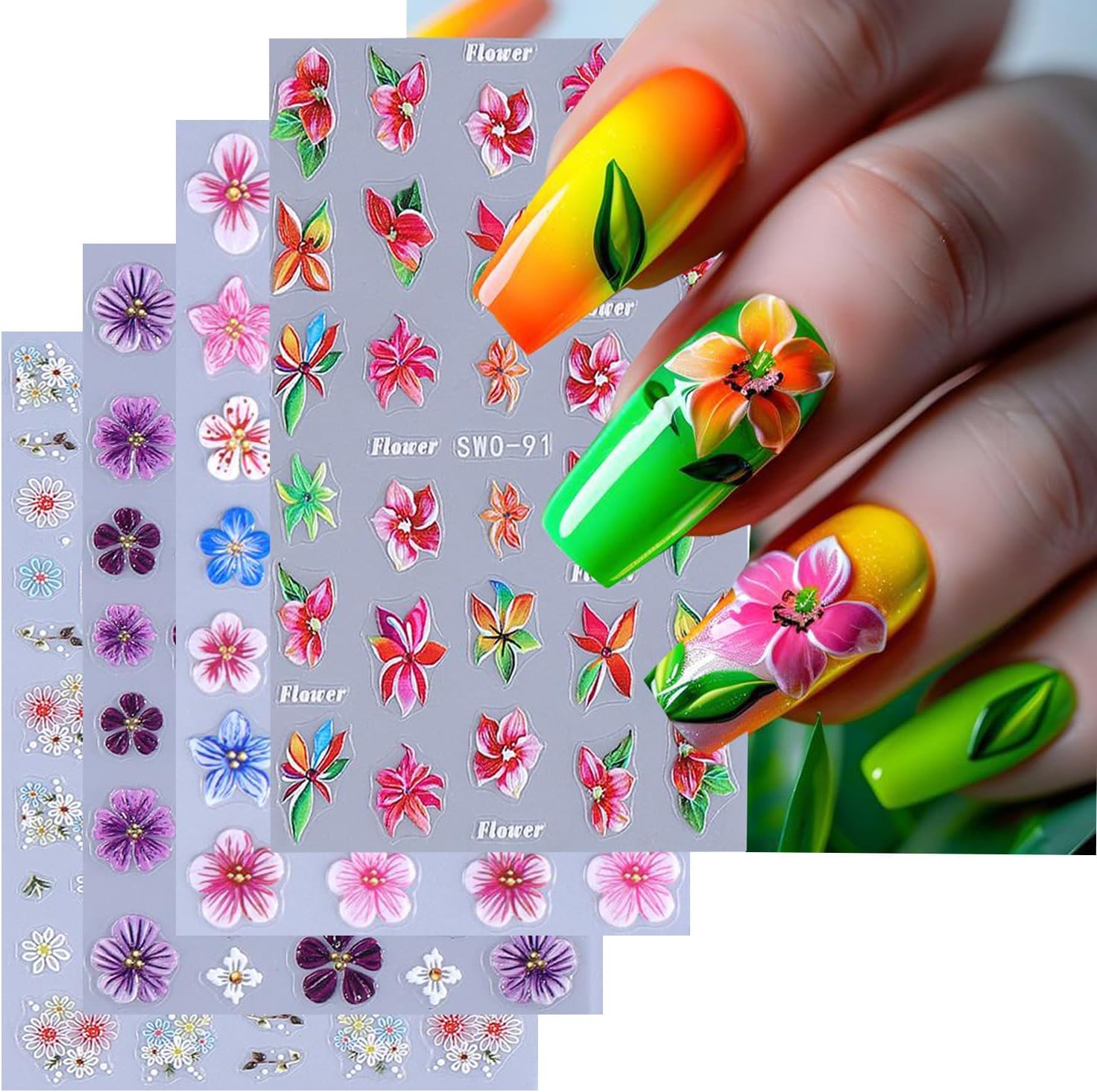 - QuantityďźYou will get 4 sheets 3D flowers nail art adhesive stickers, each paper measure 3.9 x 2.5 inches(10x6.5 cm). Pink flowers, red flower, blue flower, purple flower, daisy etc patterns design for your choice, these nail stickers are perfect for matching other nail art