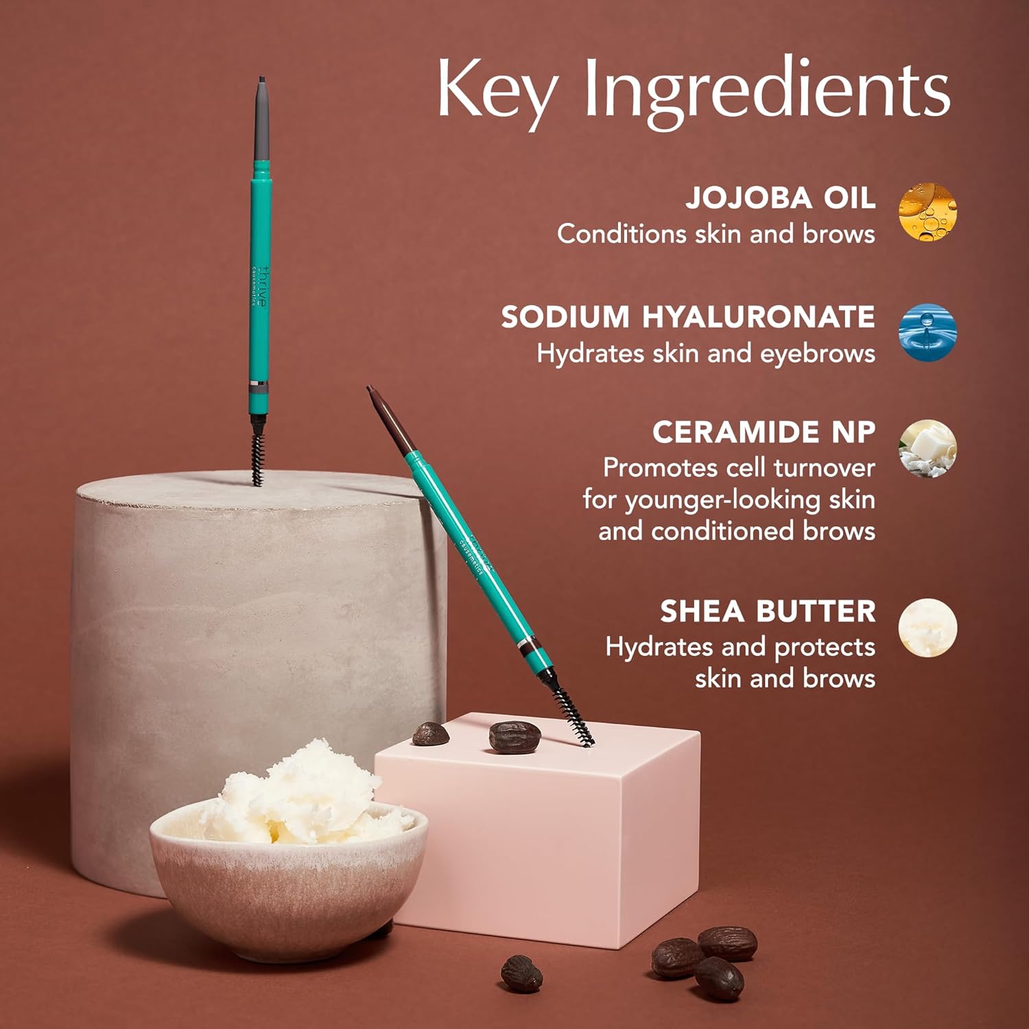 - CONDITIONING FORMULA: Infused with shea butter, hyaluronic acid, and ceramides, this eyebrow pencil nourishes the skin and supports the look of healthier, fuller brows over time. These ingredients help maintain the appearance of softness and moisture in the brow area.